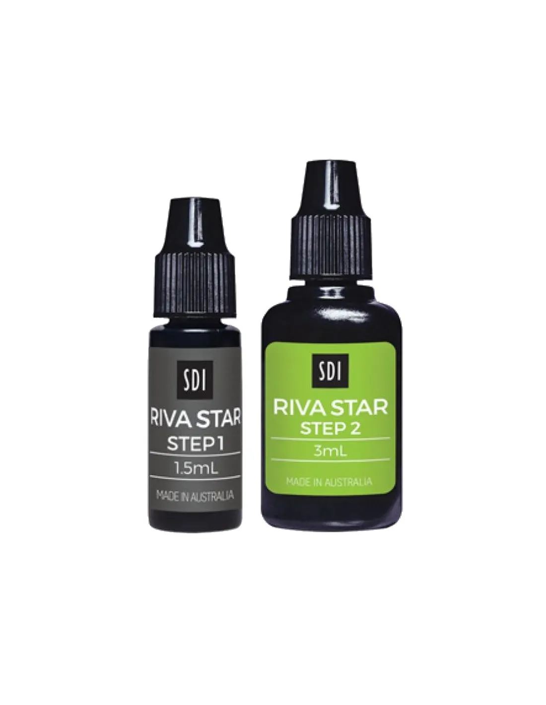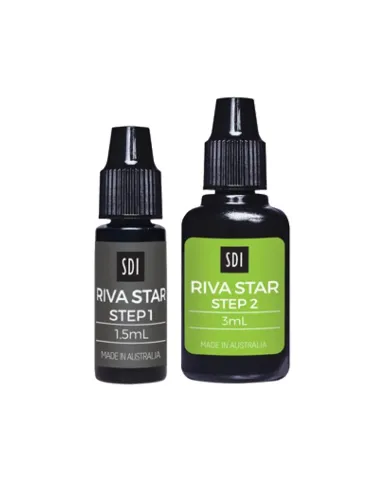 El envase de Riva Star Kit de SDI contiene 2 botellas de Riva Star: paso 1 - botella de 1,5 ml (etiqueta gris) y paso 2 - botella de 3 ml (etiqueta verde)