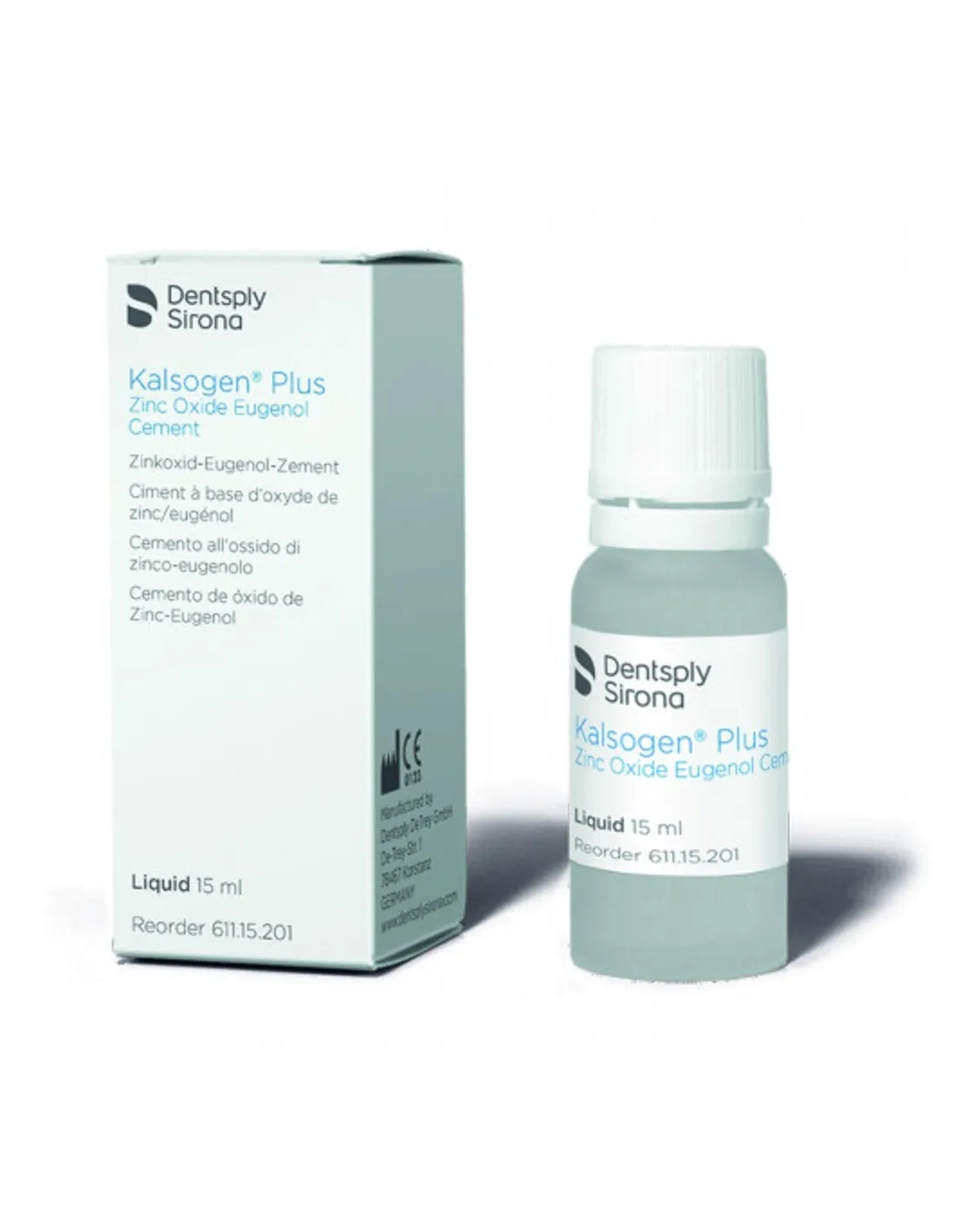 El Kalsogen Plus de Dentsply es un líquido para mezclar con polvo y formar cemento de óxido de zinc y eugenol de fraguado rápido.