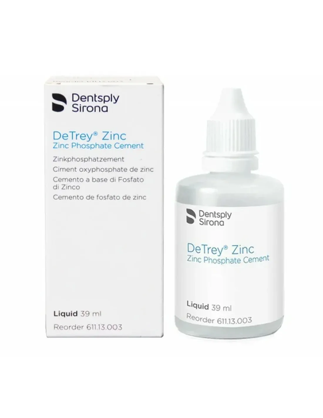 El envase del oxifosfato de zinc DeTrey Zinc líquido contiene 1 frasco con 39ml.