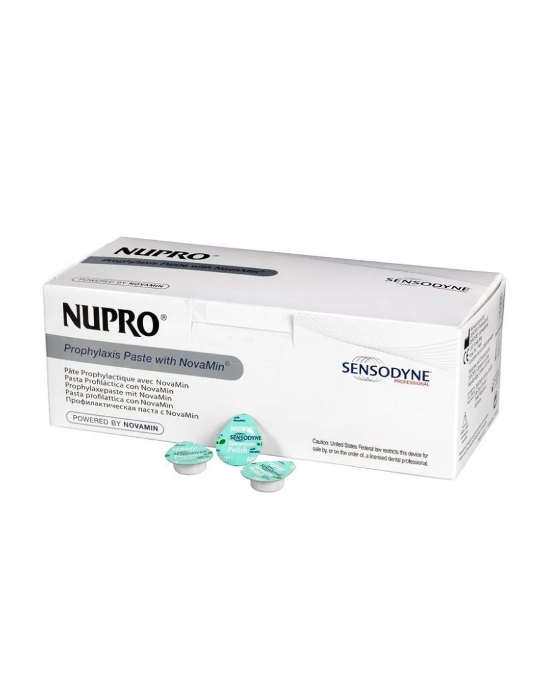 Nupro Sensodyne Prophy Paste proporciona un alivio inmediato de la sensibilidad gracias al exclusivo Novamin, un fosfosilicato de calcio biodisponible.