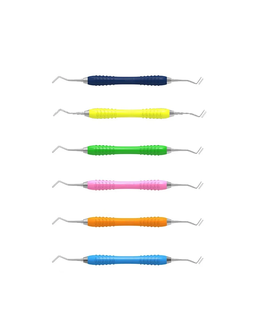Mango de silicona termoestable y antideslizante de núcleo de acero inoxidable muy ligero y sellado antibacteriano. Se presentan codificados por color para permitir una fácil identificación entre los instrumentos.