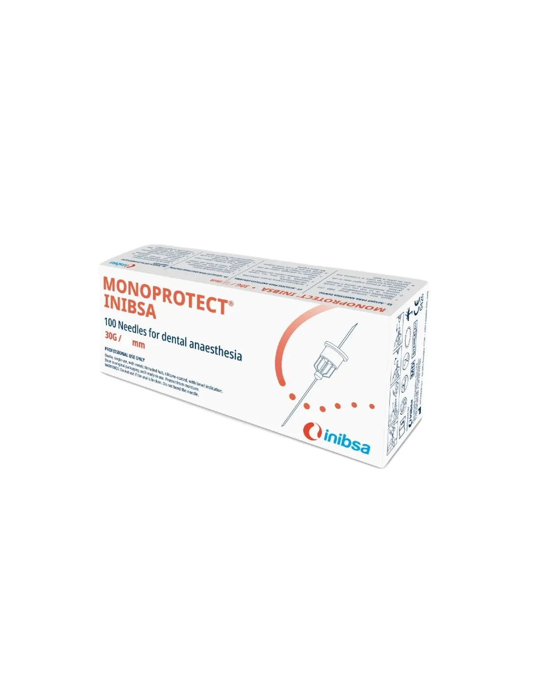 El envase de Monoprotect agujas dentales estériles desechables de Inibsa contiene: 100 unidades, a elegir tamaño entre los disponibles.