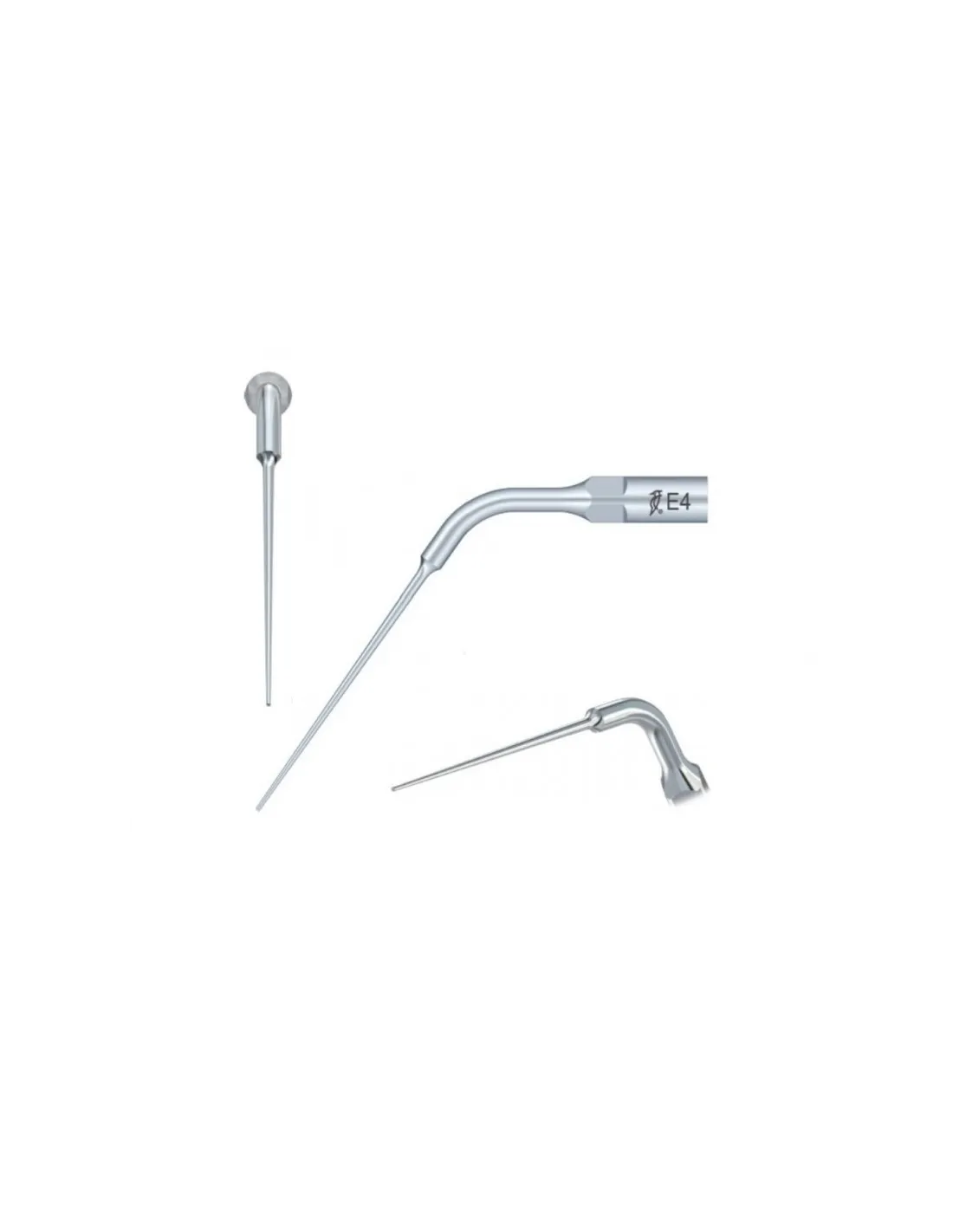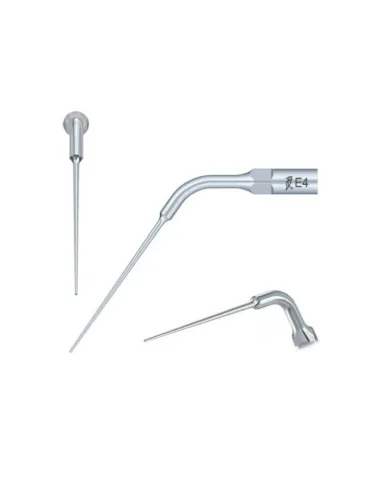 Punta dental E4 para destartraje de sistema de ultrasonidos Woodpecker indicadas para eliminar obstrucciones del relleno radicular durante el retratamiento del conducto radicular.