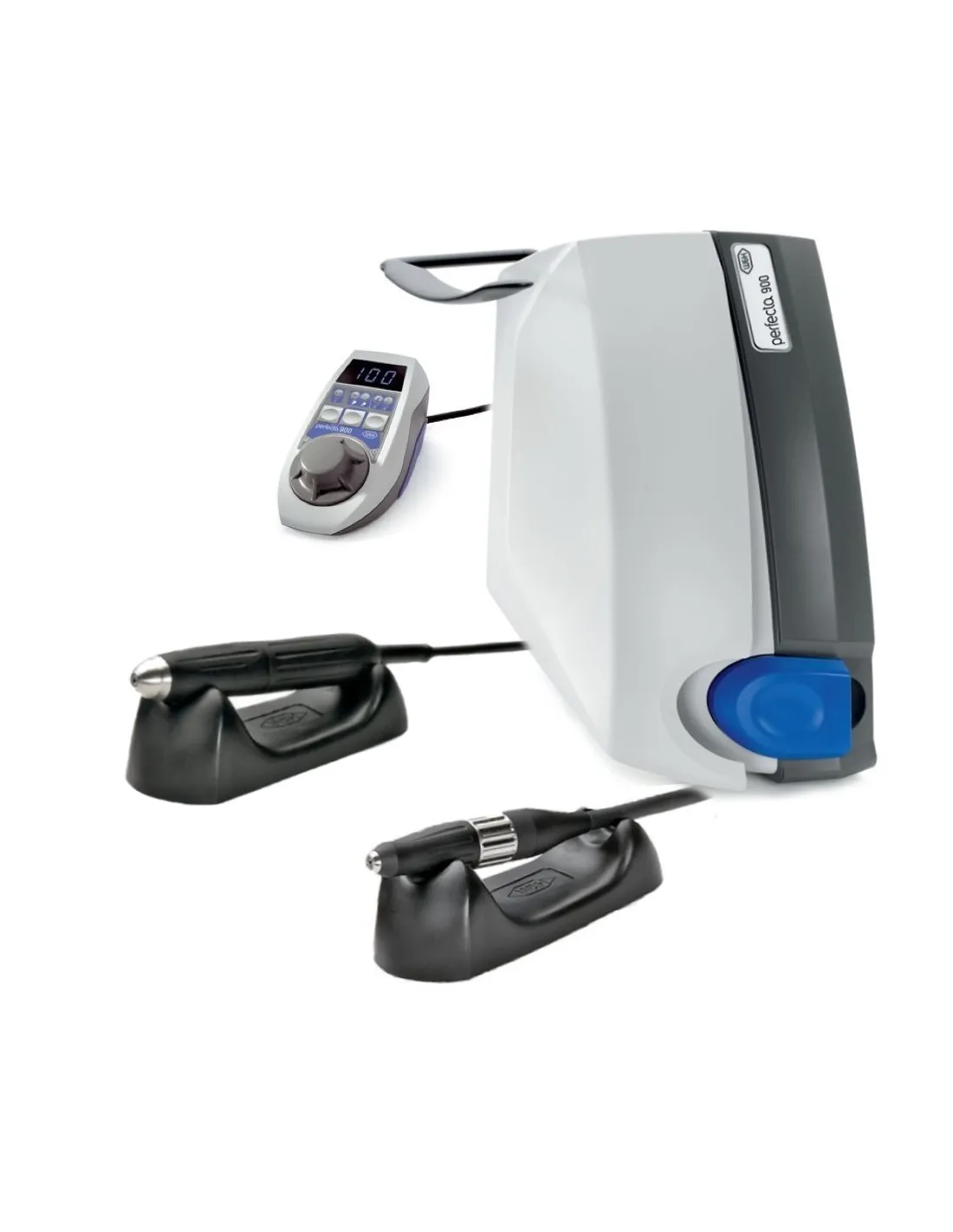 El Kit completo 923KT, especial 2 en 1 incluye: consola (equipo de rodilla) Perfecta 900, mando de control externo con display digital, pieza de mano de alta velocidad y pieza de mano LA-66, cable.