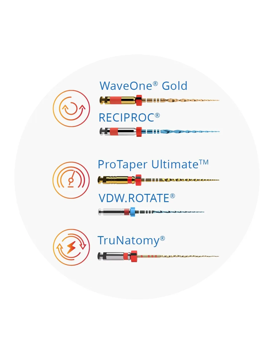 - Programas preconfigurados para WaveOne Gold, ProTaper Ultimate, TruNatomy, Reciproc y los sistemas de limas endodónticas VDW.ROTATE.