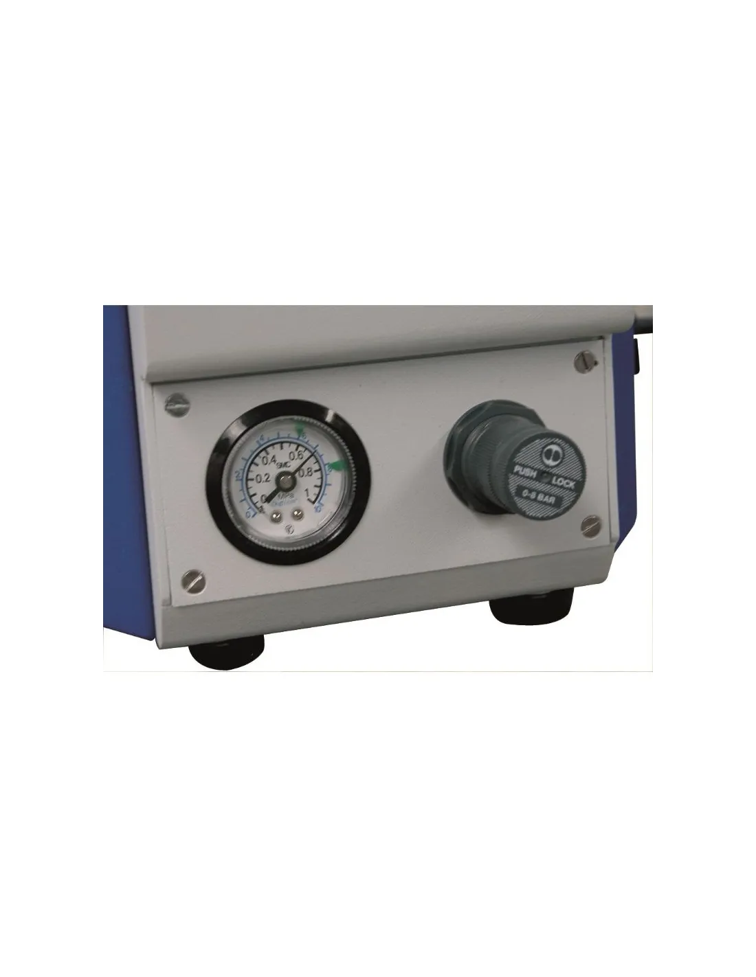 La inyectora de poliamidas dentales Mestra cuenta con regulador de presión y de manómetro.