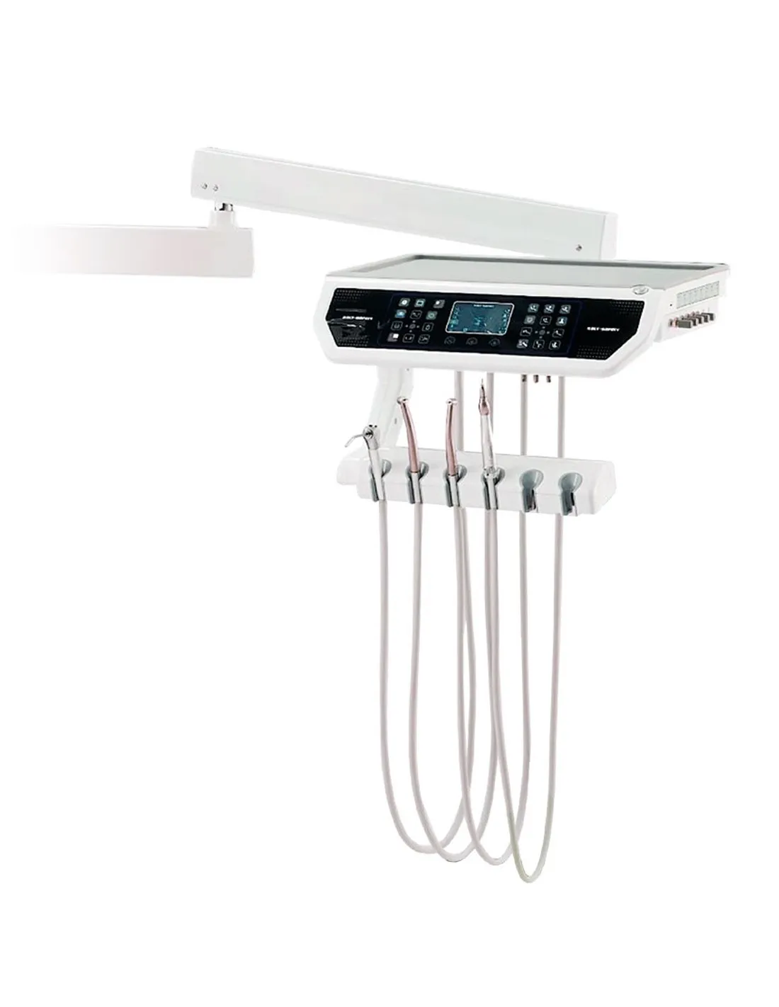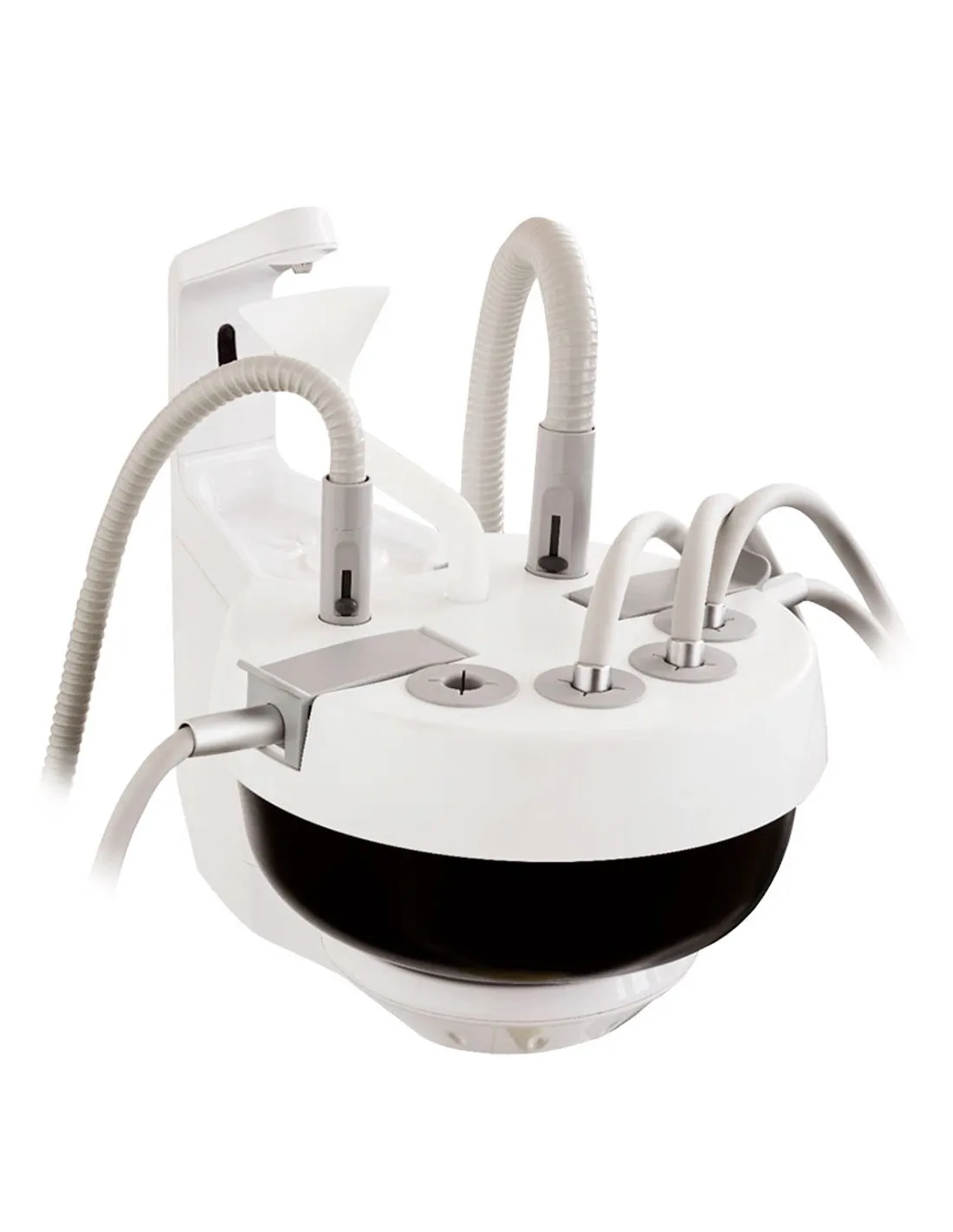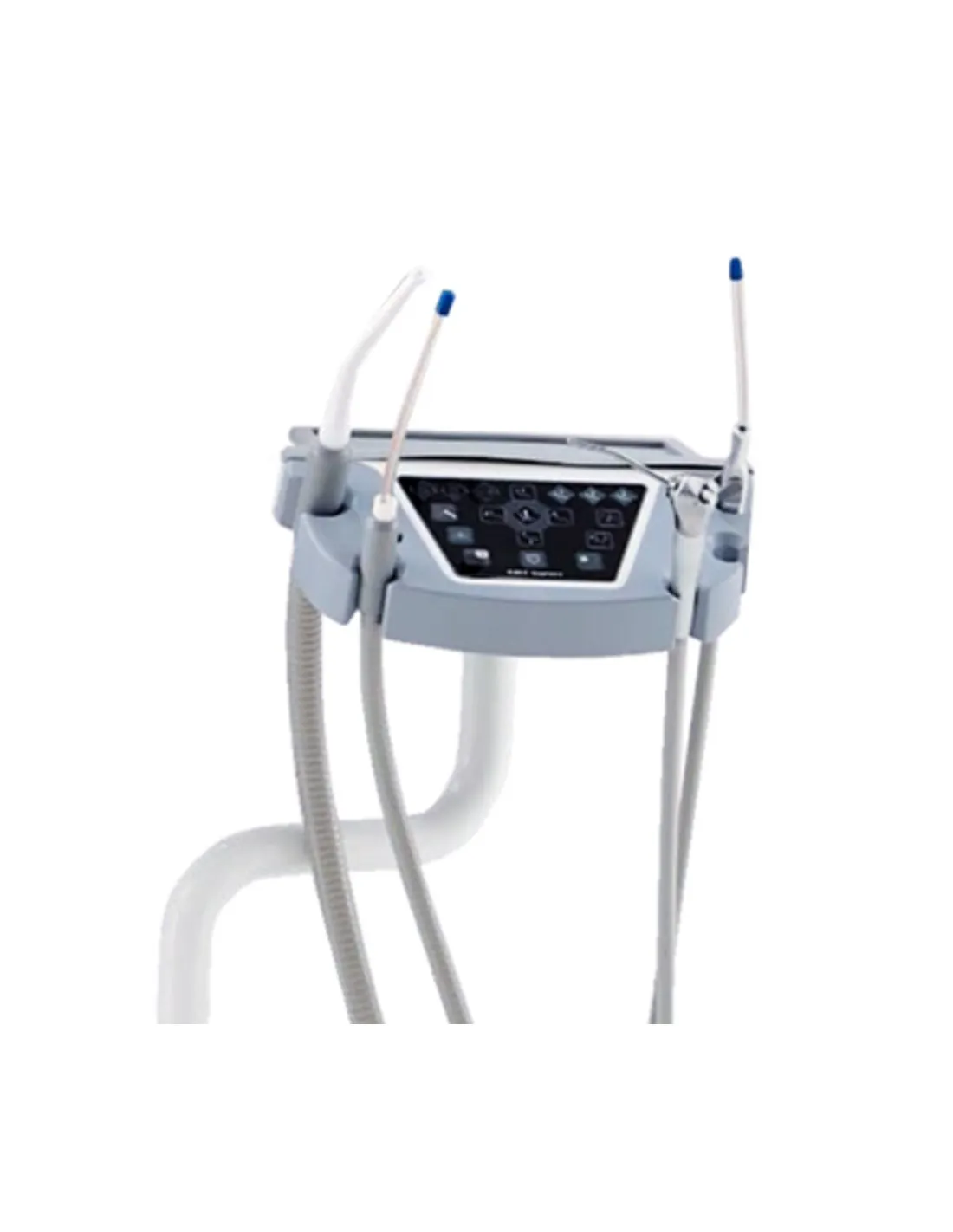 La unidad dental presenta un sistema de mangueras colgantes en cart con 5 alojamientos: