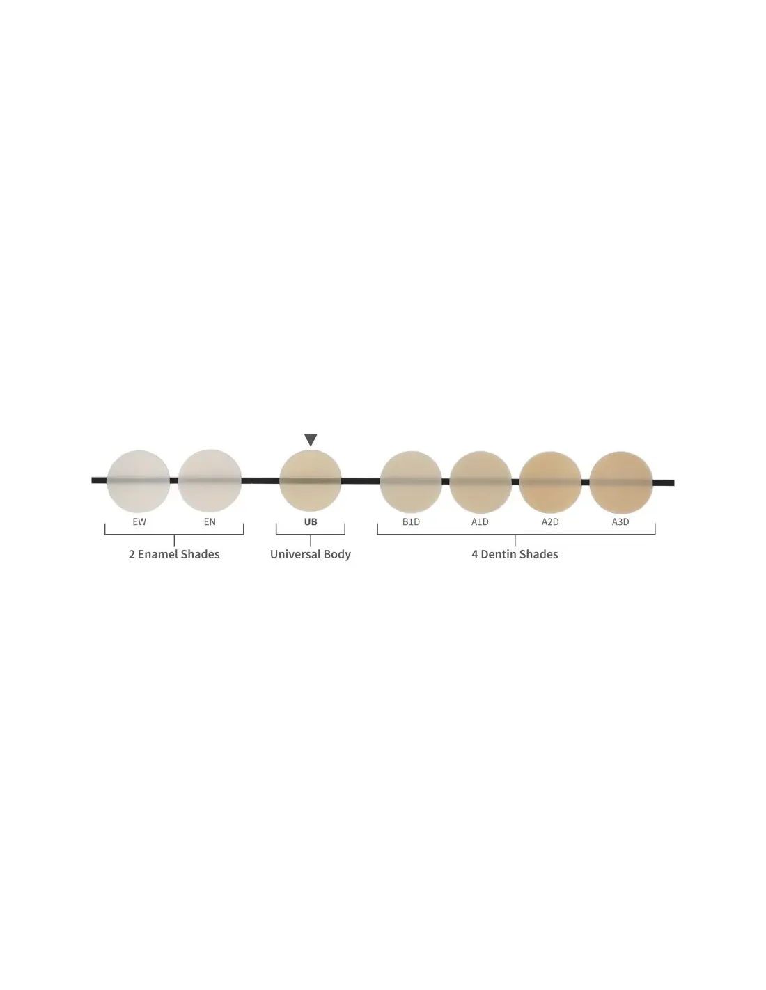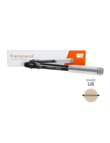 El composite universal Transcend de Ultradent ofrece una innovadora combinación de tonos. Por un lado, el tono Universal Body, gracias a su tecnología patentada Resin Particle Match, elimina la necesidad de un bloqueador u opaquer para ocultar los colores subyacentes más oscuros. Y por otro, para los casos anteriores que precisan de un mayor cuidado estético, cuenta con un sencillo y complementario sistema de colores que incluye cuatro colores de dentina (A1D - A2D - A3D y B1D) y dos de esmalte (EN y EW).