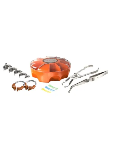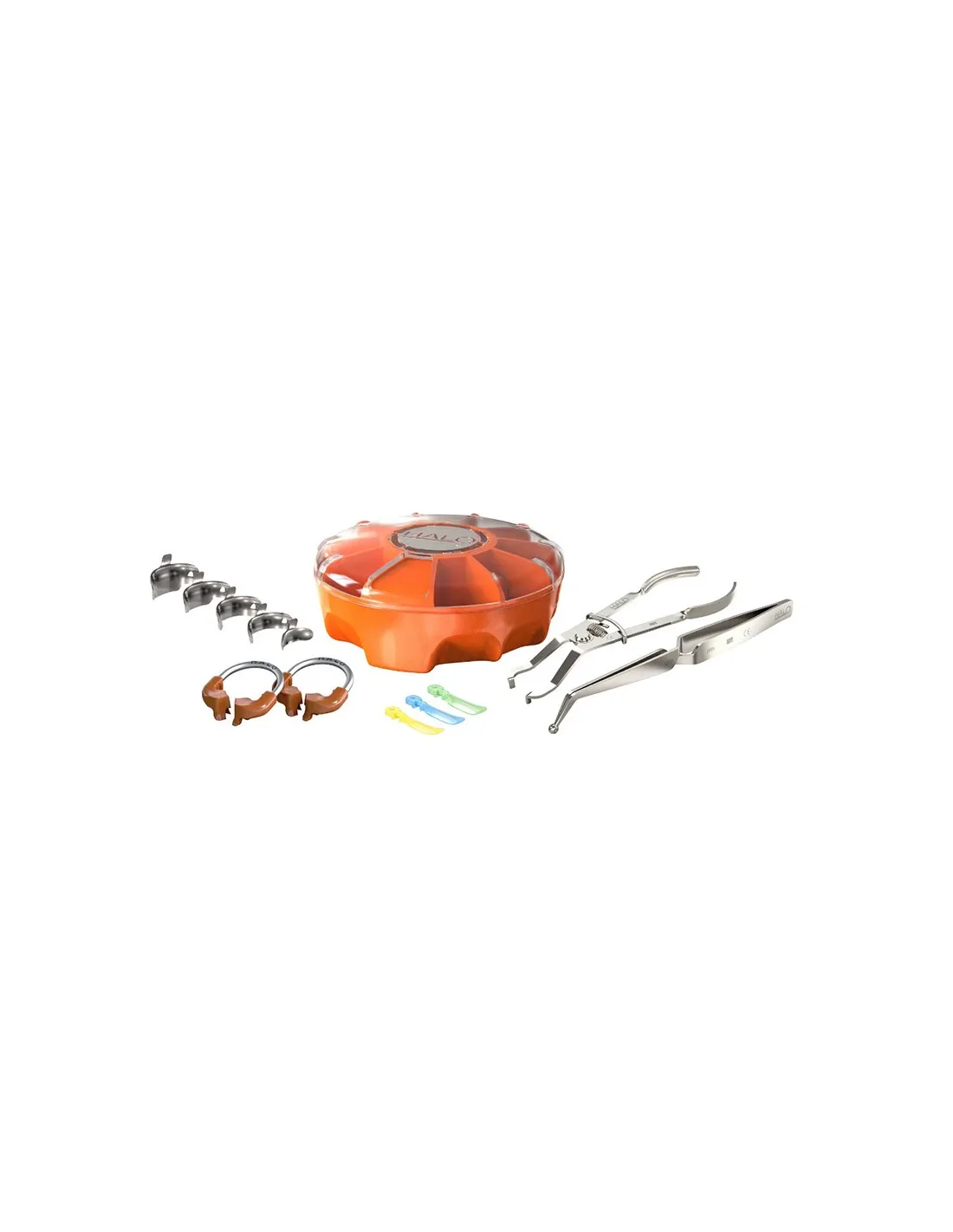 - Contiene 125 bandas matrices originales, 75 cuñas, 2 anillos, 2 instrumentos (pinza y fórceps) y 1 carrusel dispensador.