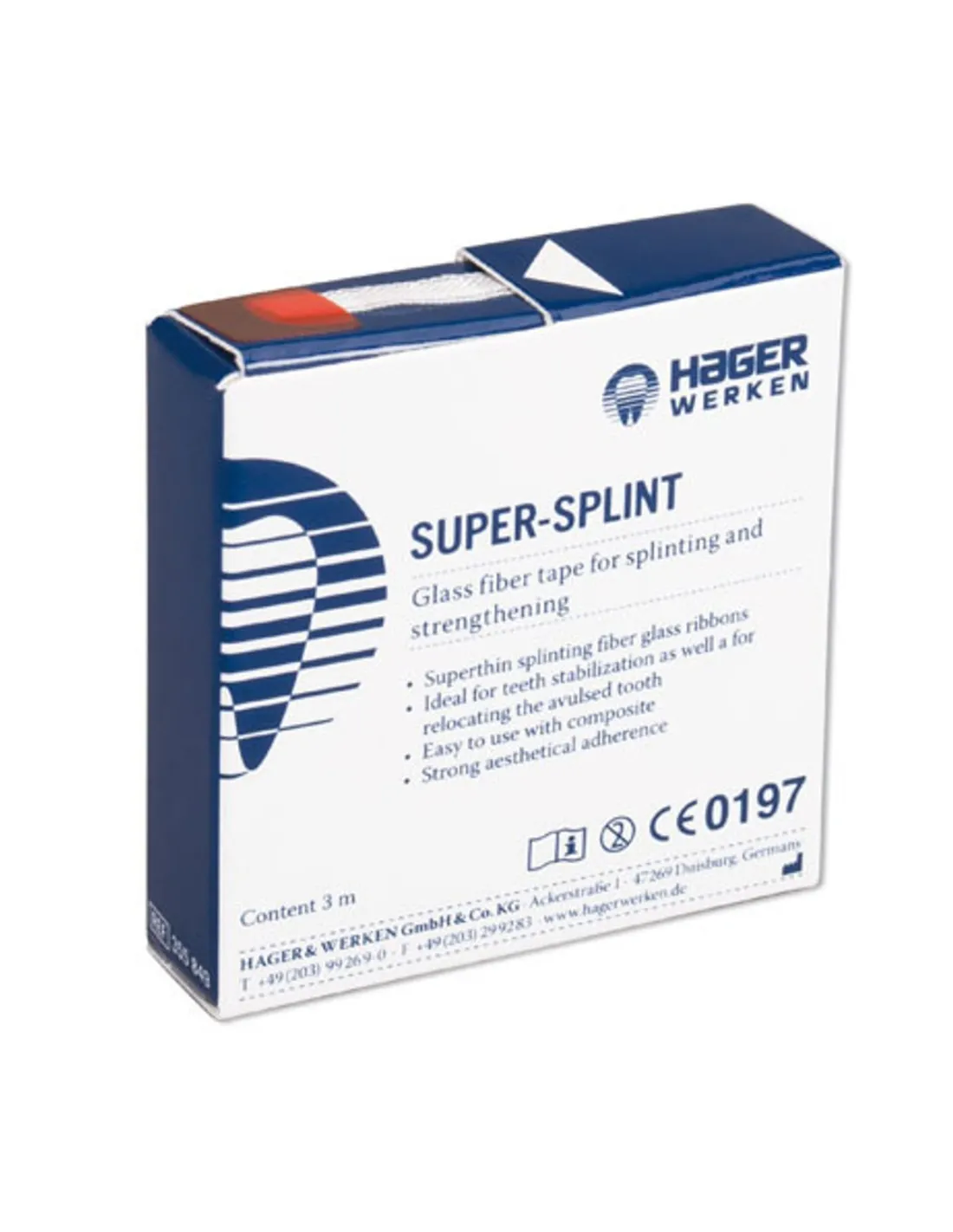 La tira de fibra de vidrio Super-Splint Fiber Glass de Hager Werken se presenta en un práctico dispensador de 3 m de longitud que evita malgastar material.