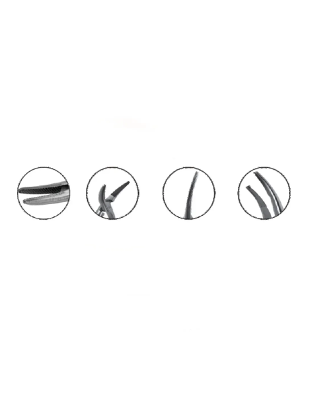 - Porta agujas, tipo Castroviejo, fino y ligero con agarre estríado para mayor comodidad. Acero inox con parte activa fina y estriada reforzada con tungsteno.