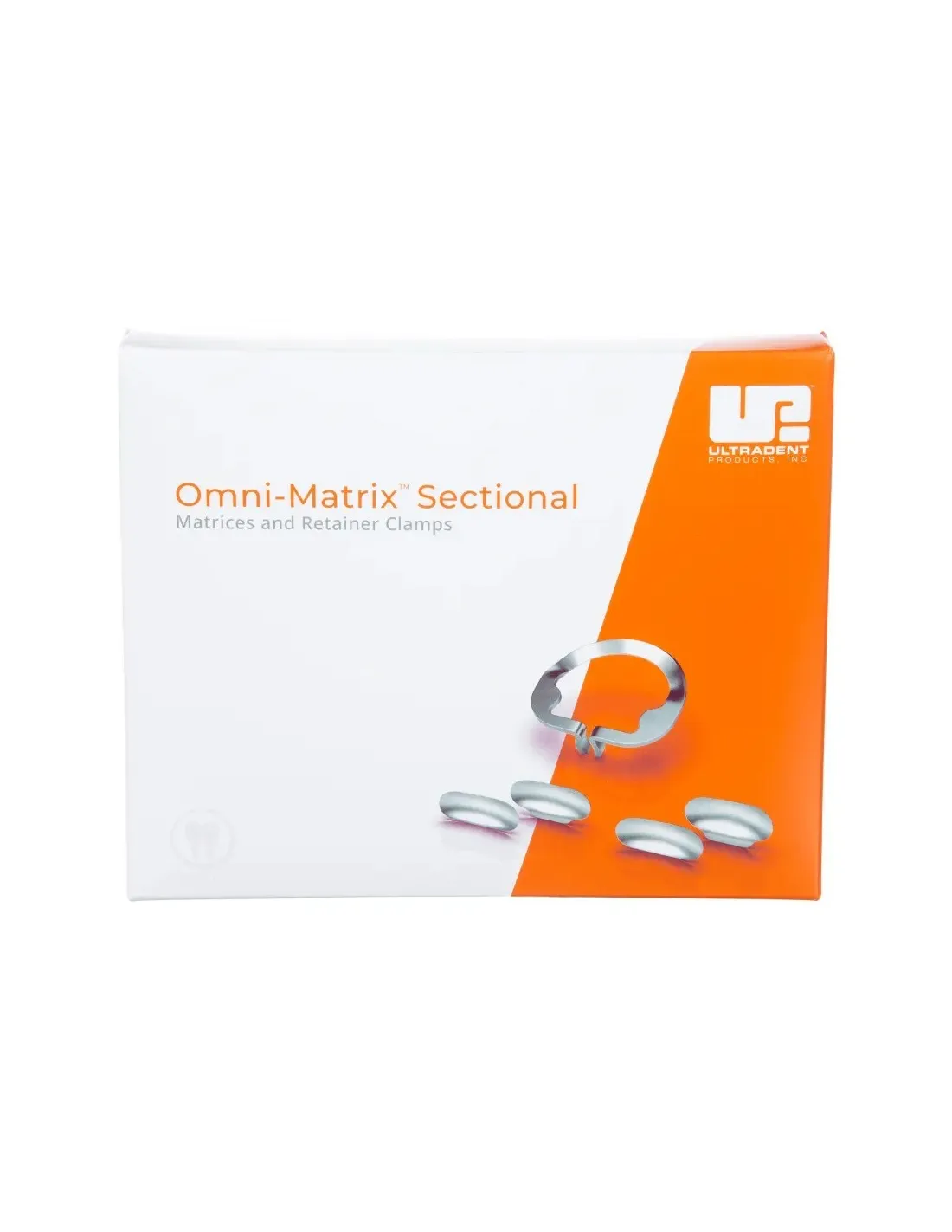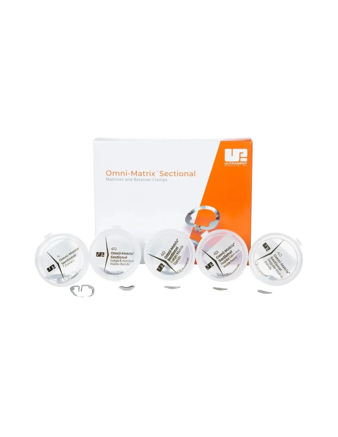 Omni Matrix Sectional de Ultradent es un sistema de matrices seccionales que cuenta con cuatro tamaños de bandas de acero inoxidable y una abrazadera de retención de un tamaño.