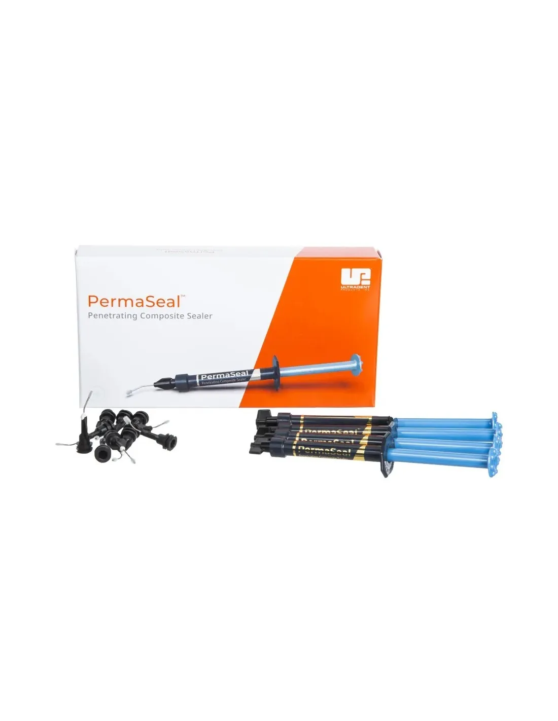 El envase de PermaSeal kit de Ultradent contiene: 4 de jeringas de 1,2 ml + 10 puntas Black Mini FX.