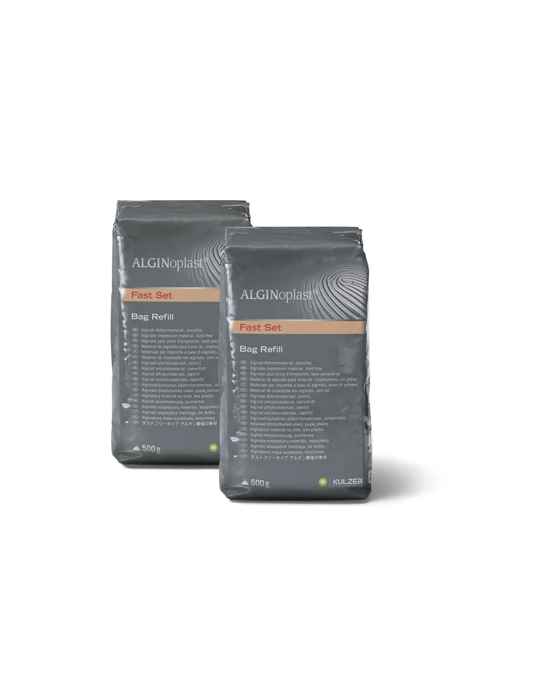 Alginoplast de Kulzer es un alginato libre de polvo de toma rápida tipo 1, en color rosa y de gran consistencia.