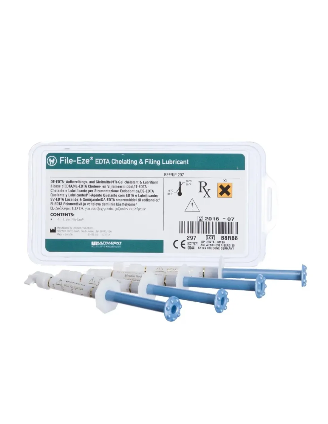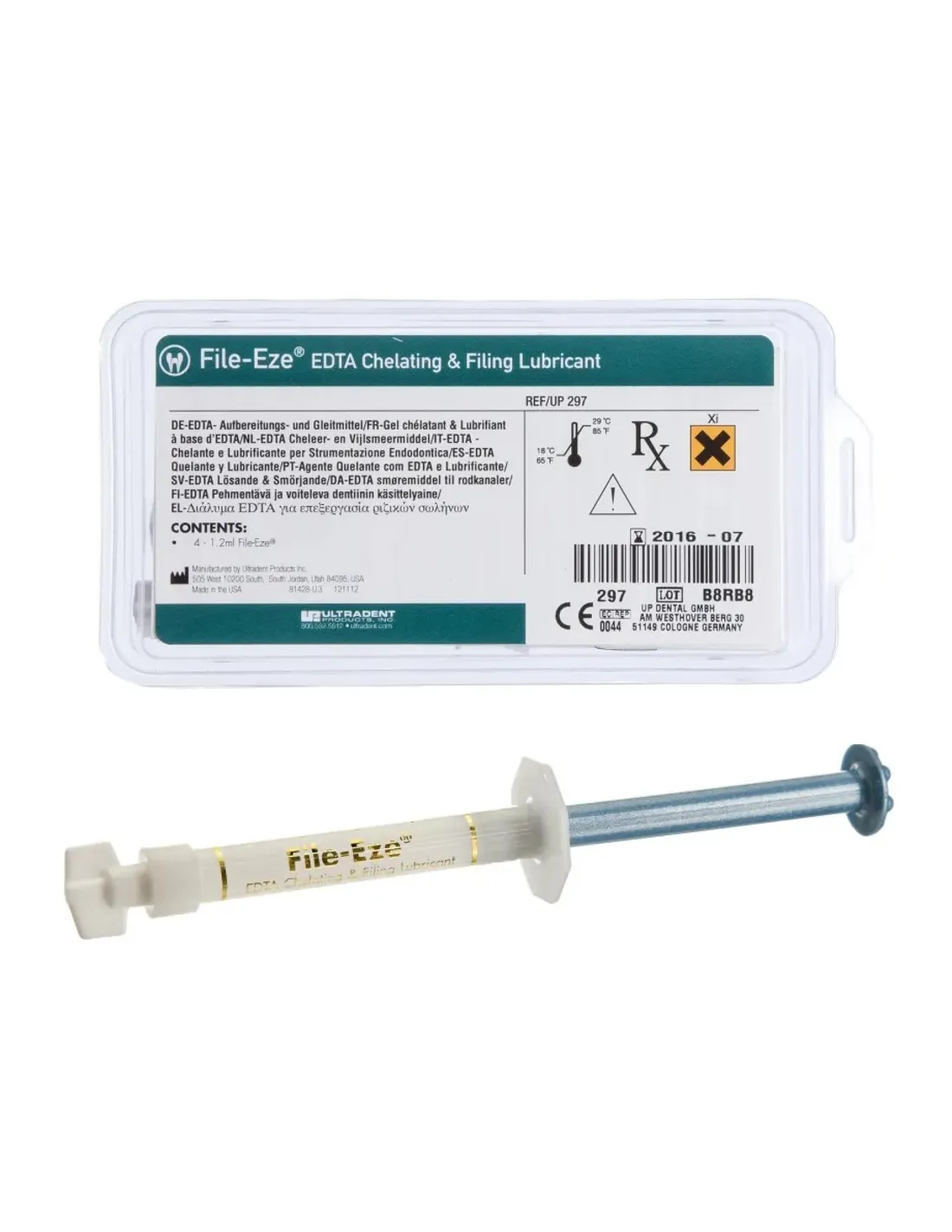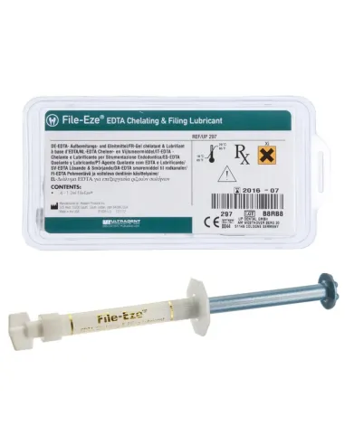 File-Eze refill de Ultradent es una solución EDTA 19% hidrosoluble viscosa con una base lubricante para quelar, lubricar y desbridar preparaciones del conducto radicular y ayudar a la instrumentación.