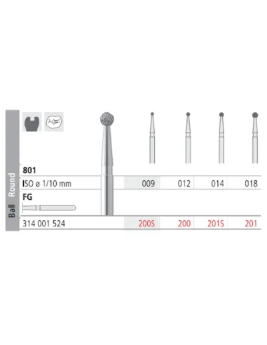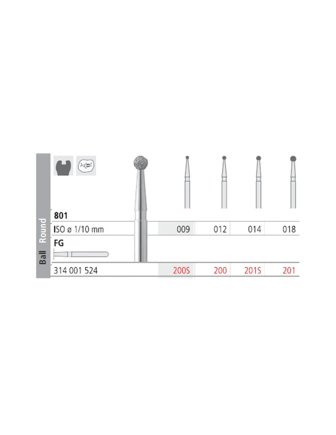 La fresa diamante 801 presenta forma de bola y granulado standard.