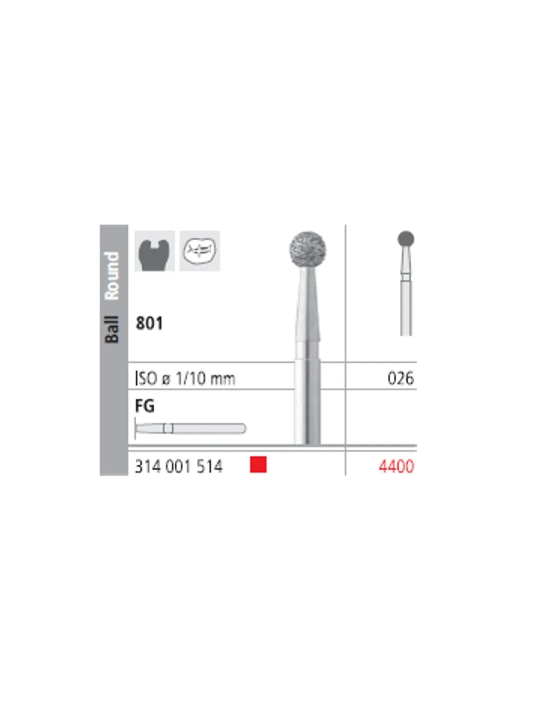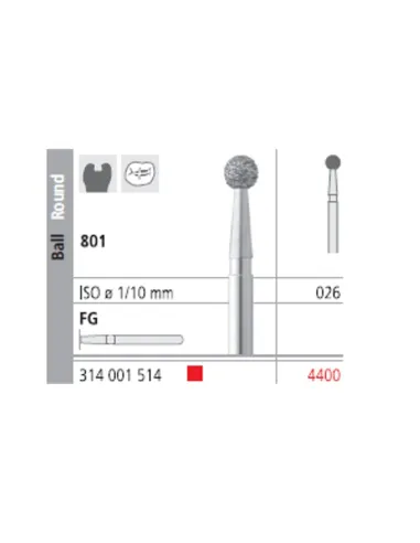 La fresa 801-026 es una fresa diamante con forma de bola, de grano fino (banda roja) y con parte activa de Ø 026.