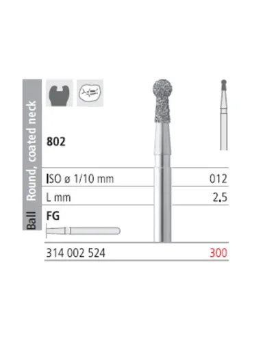 La fresa 802-012 es una fresa diamante con forma de bola con cuello recubierto y de grano medio.
