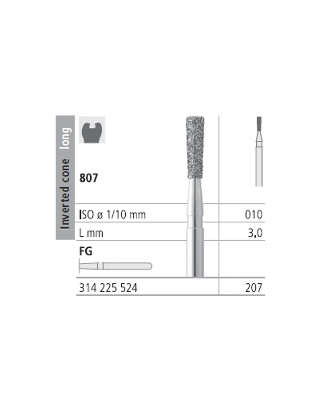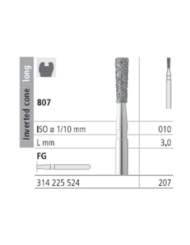 La fresa 807-010 es una fresa diamante con forma de cono invertido largo y de grano medio.