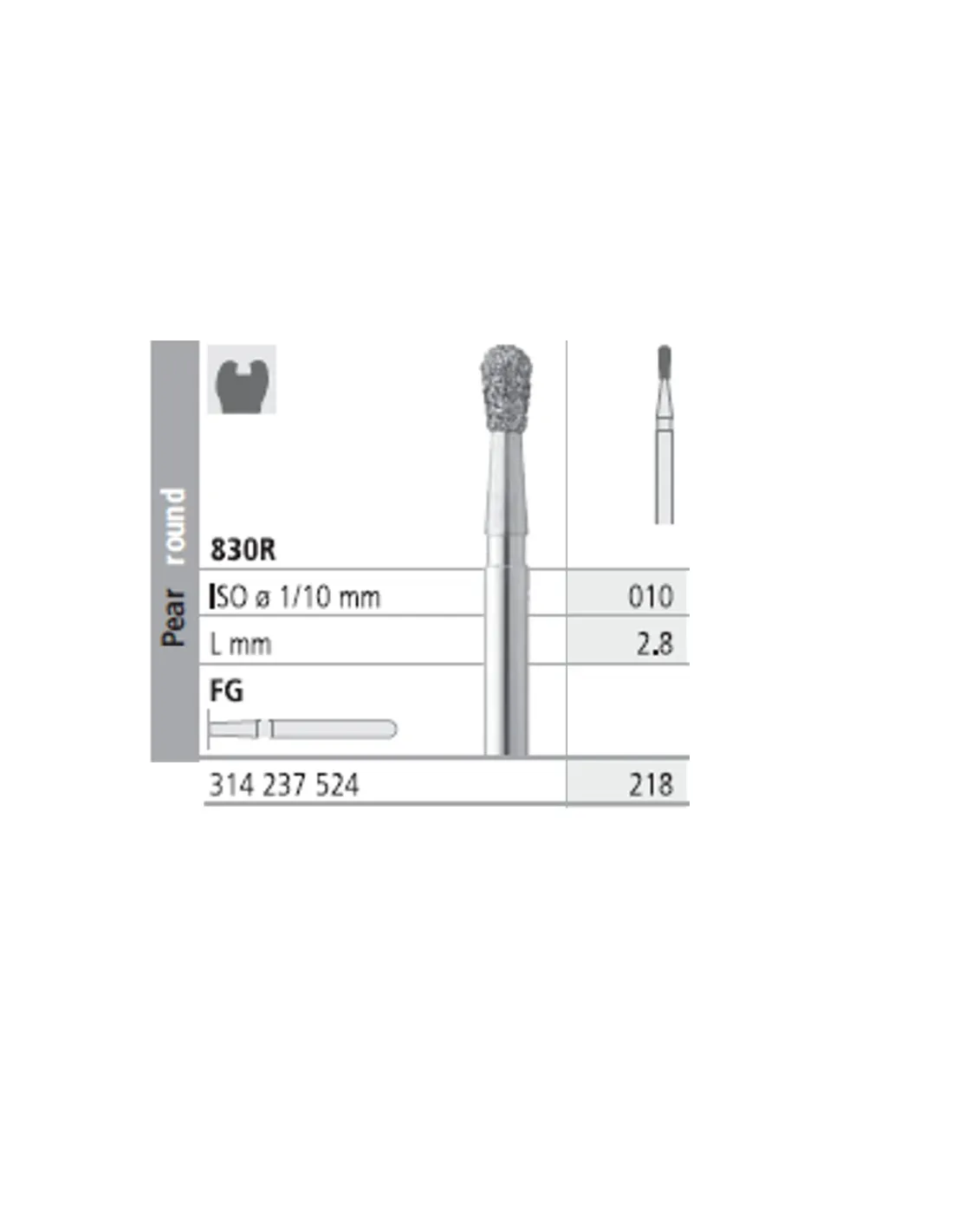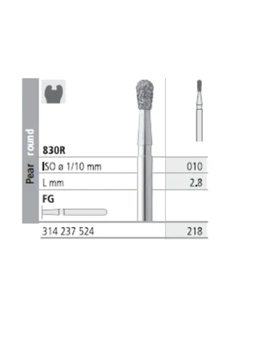 La fresa 830R-010 presenta su parte activa con forma de pera redonda con longitud 2,8 mm y Ø 010.