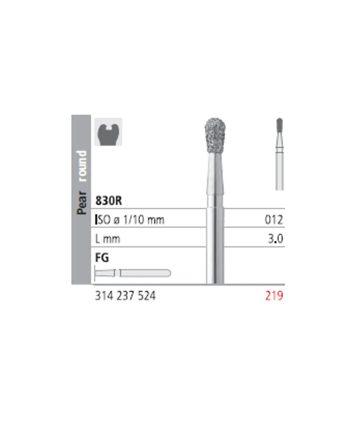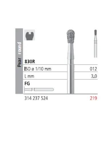 La fresa 830R-012 presenta su parte activa con forma de pera redonda con longitud 3 mm y Ø 012.