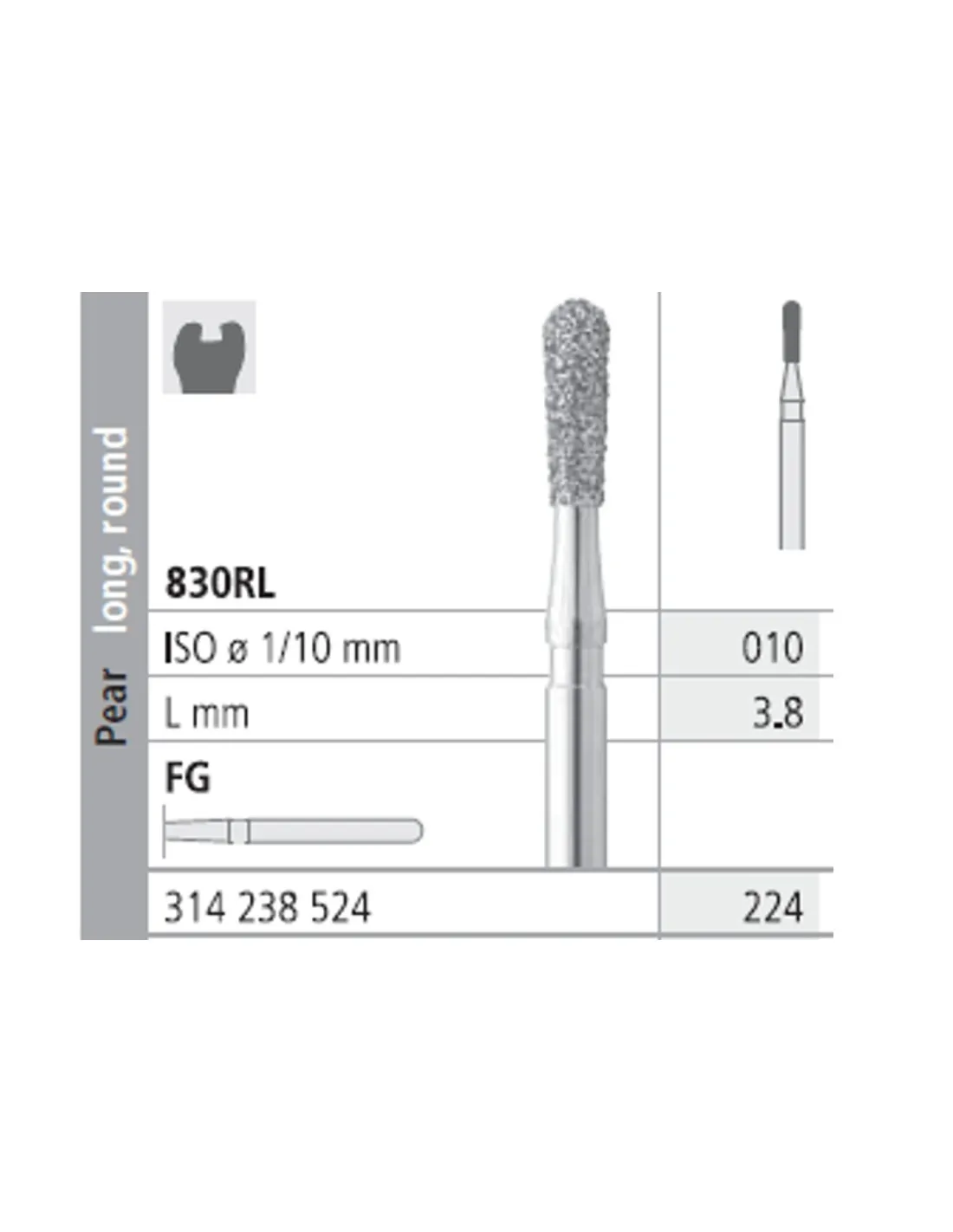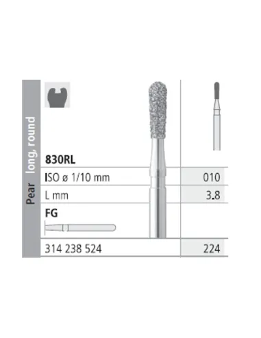 La fresa 830RL-010 presenta su parte activa con forma de pera larga redonda con longitud 3,8 mm y Ø 010.