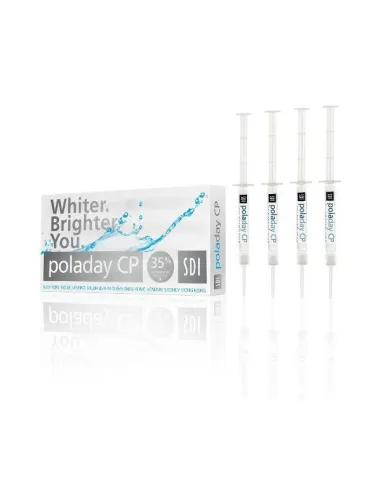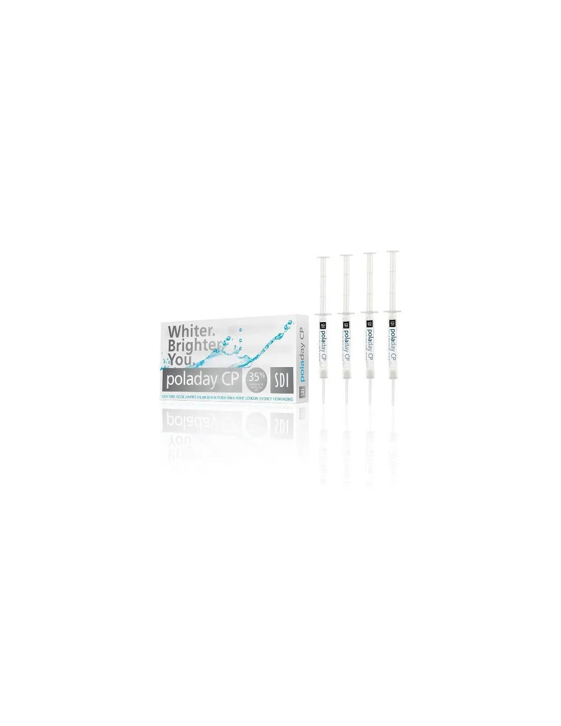 Pola Day CP de SDI es un sistema "iniciador" para antes de iniciar el tratamiento de aplicación en el hogar. Es un producto para el blanqueamiento con una alta concentración de peróxido de carbamida para un blanqueamiento superior por lo cual debe ser aplicado en clinicas y por profesionales, rebaja más tonos en menos tiempo que las concentraciones habituales.