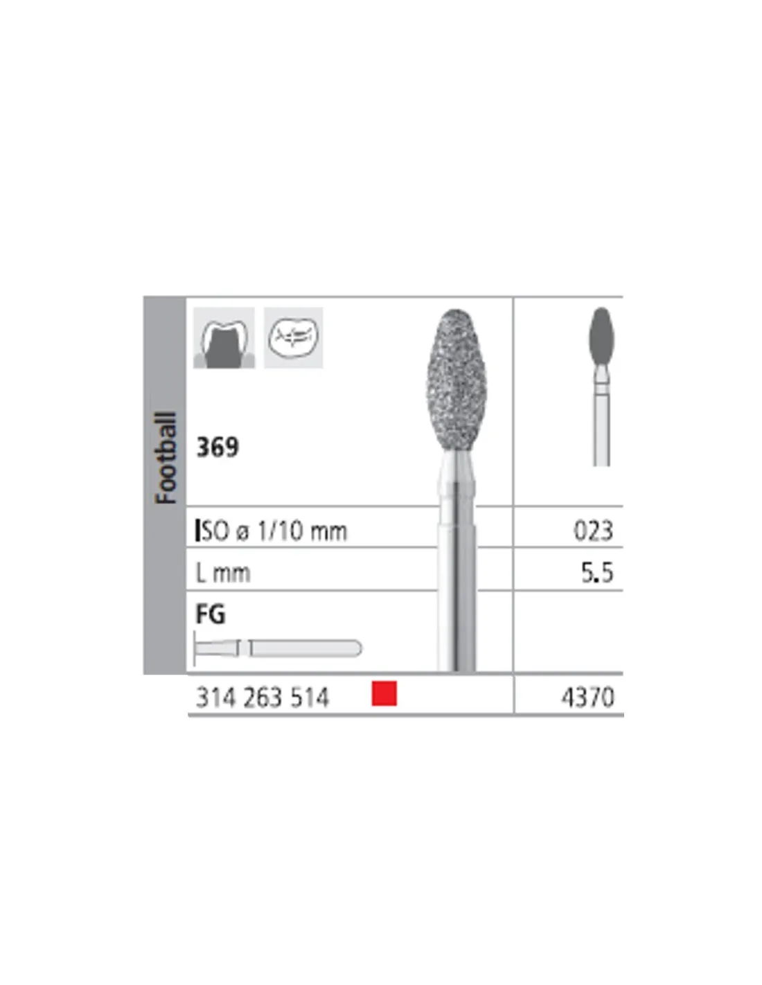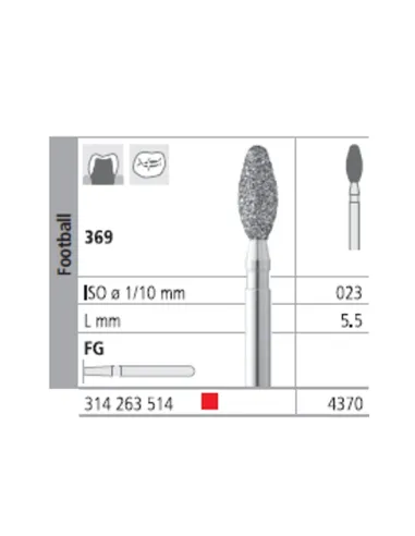 La fresa 369-023 presenta su parte activa con forma de un huevo / balón de rugby. Longitud 5,5 mm y Ø 023. Grano diamante fino, banda roja.