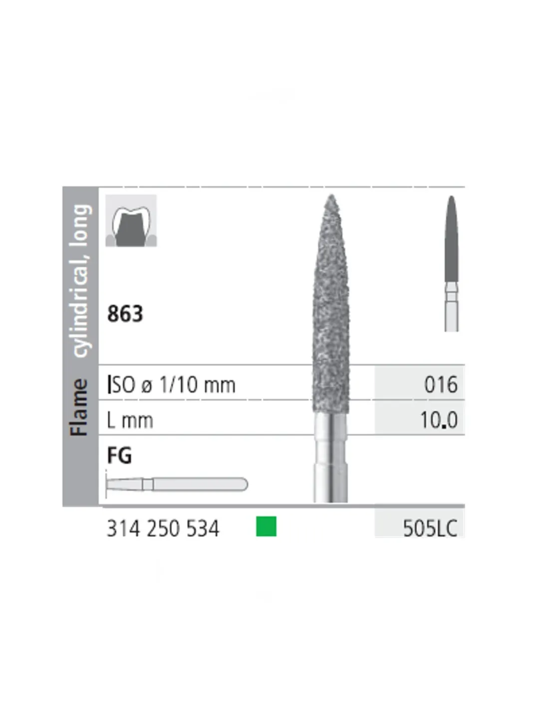 La fresa 863-016 presenta su parte activa con forma de llama cilíndrica, larga.