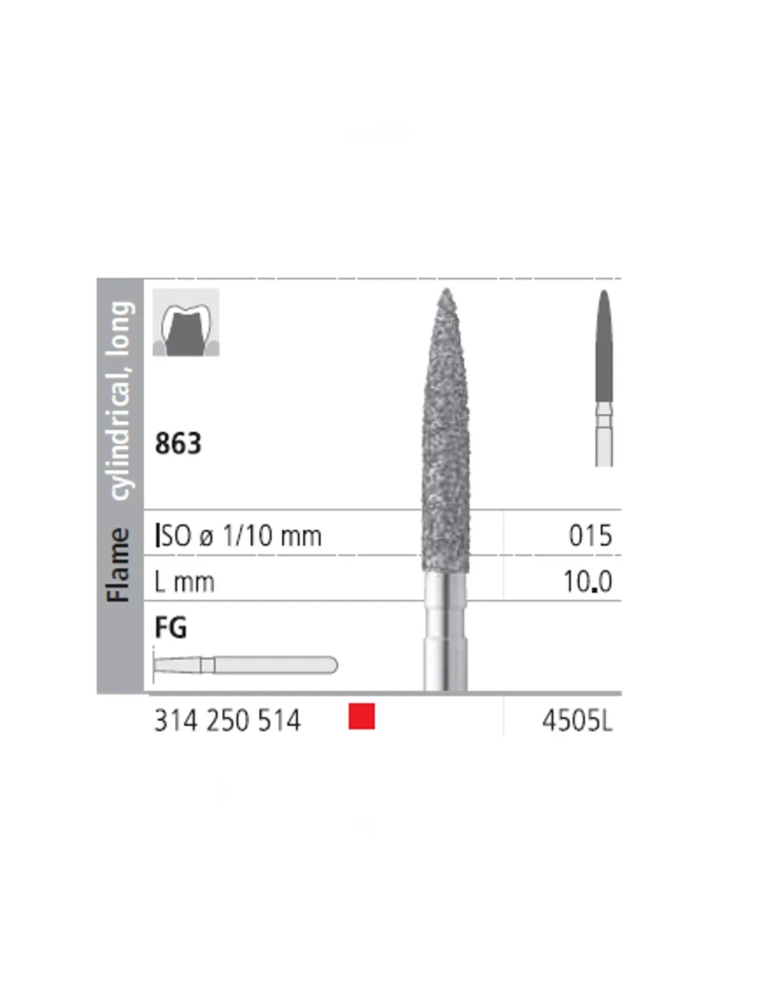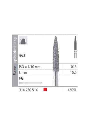 La fresa 863-015 presenta su parte activa con forma de llama cilíndrica, larga.
