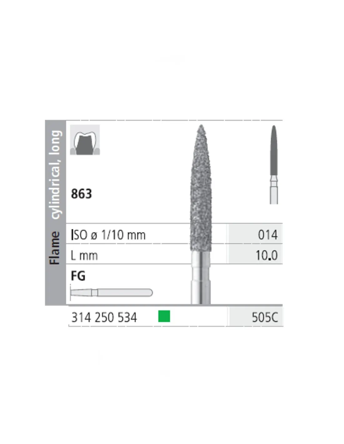 La fresa 863-014 presenta su parte activa con forma de llama cilíndrica, larga.