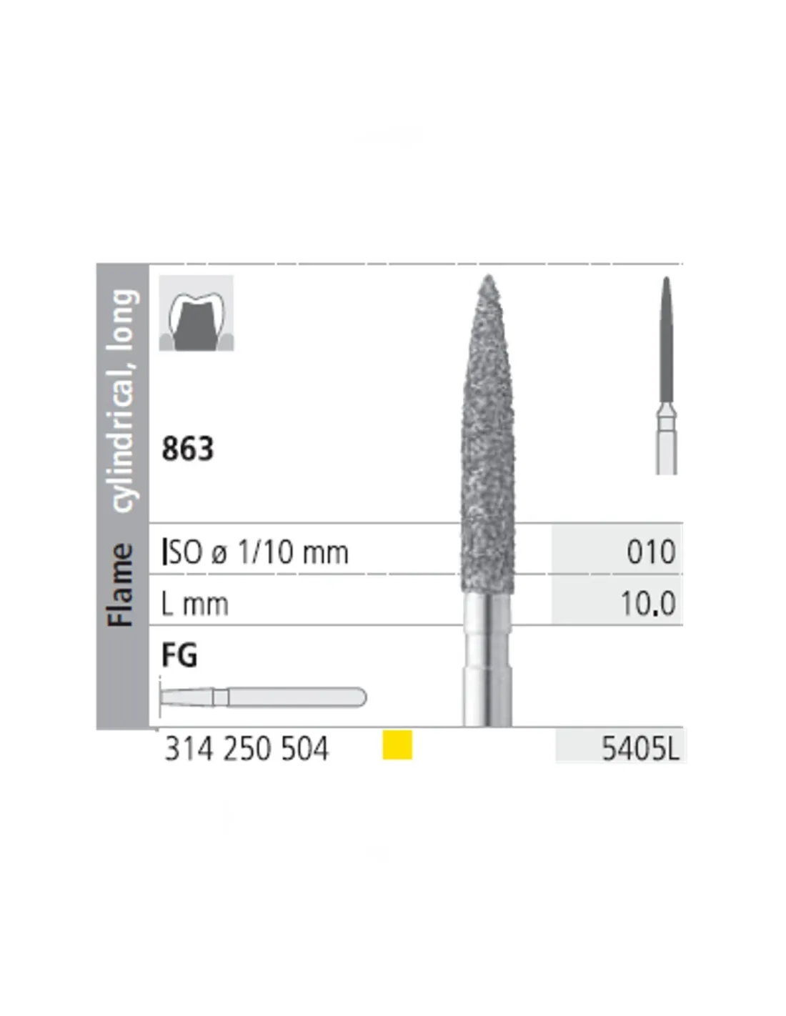 La fresa 863-010 presenta su parte activa con forma de llama cilíndrica, larga.