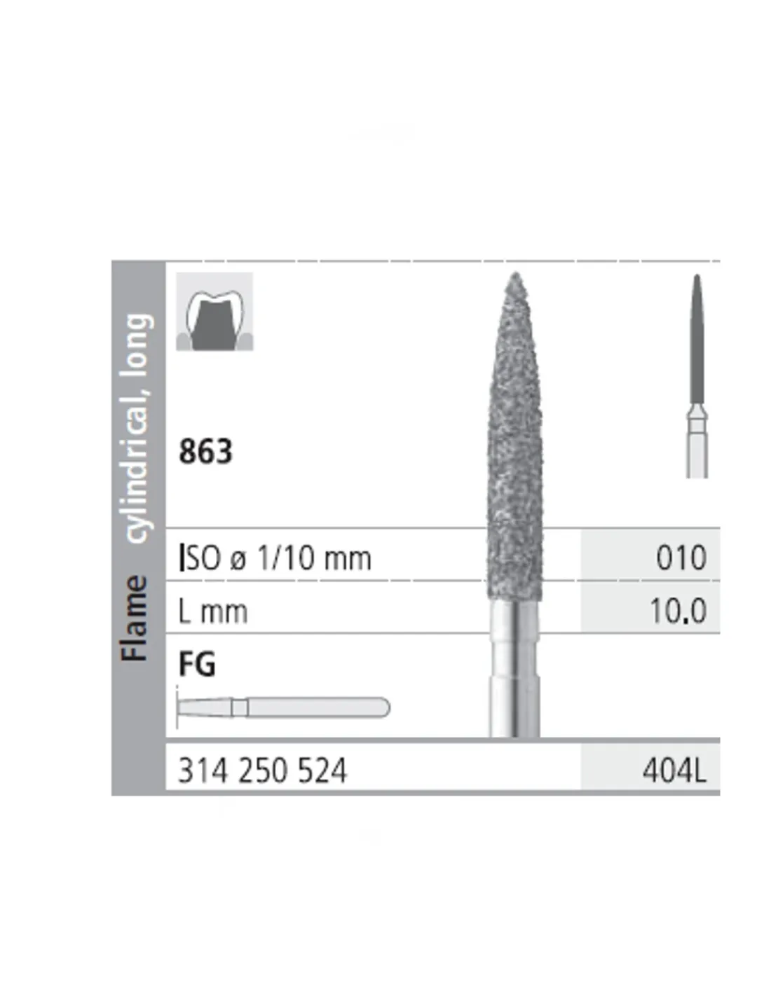 La fresa 863-010 presenta su parte activa con forma de llama cilíndrica, larga.