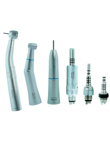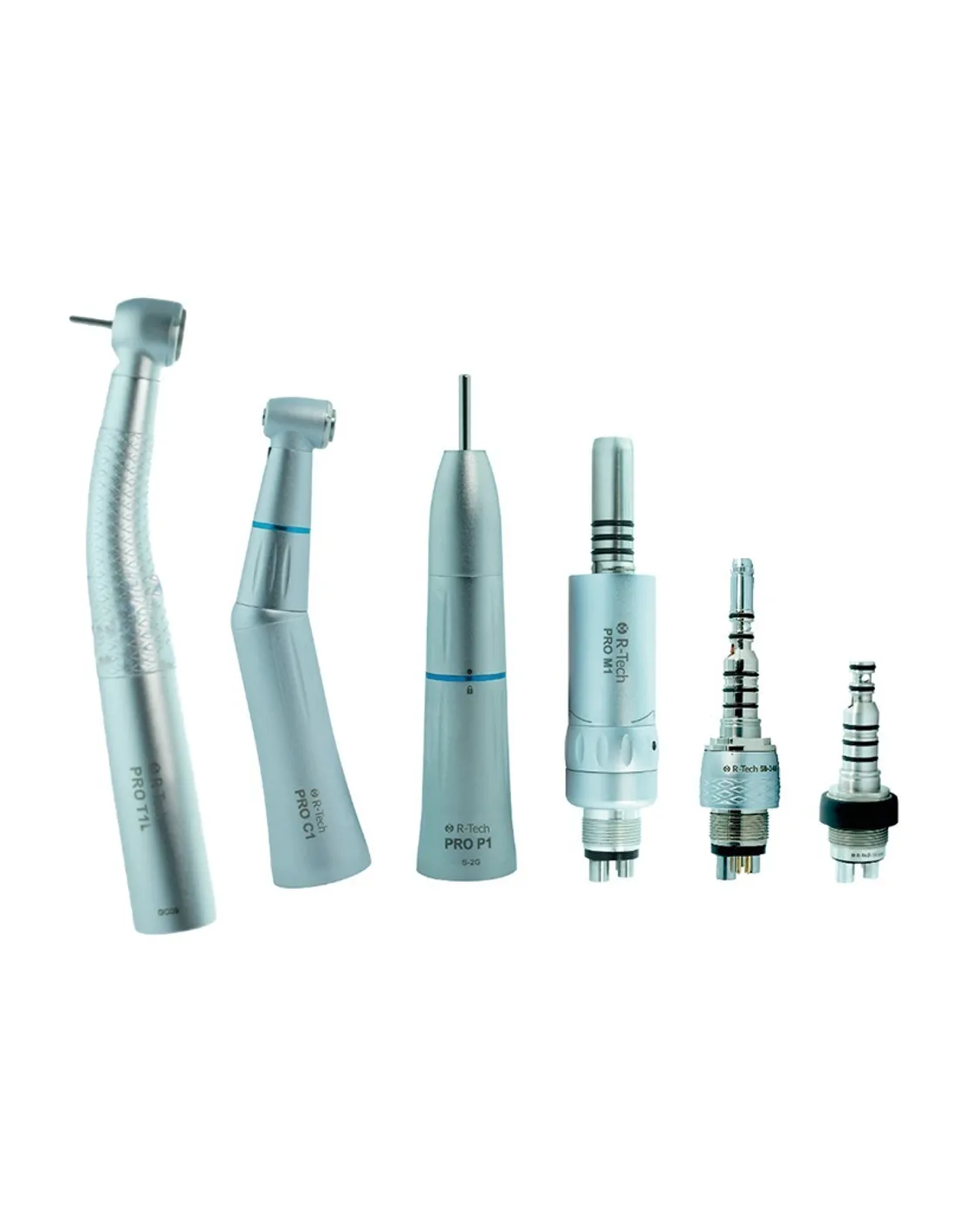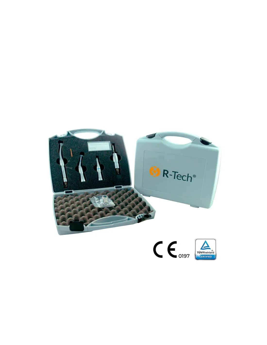 El kit de instrumental rotatorio de R-Tech Pro T Quick LED + Acople sin Luz cuenta con: turbina, pieza de mano, contraángulo, micromotor, acople LED y acople sin luz:
