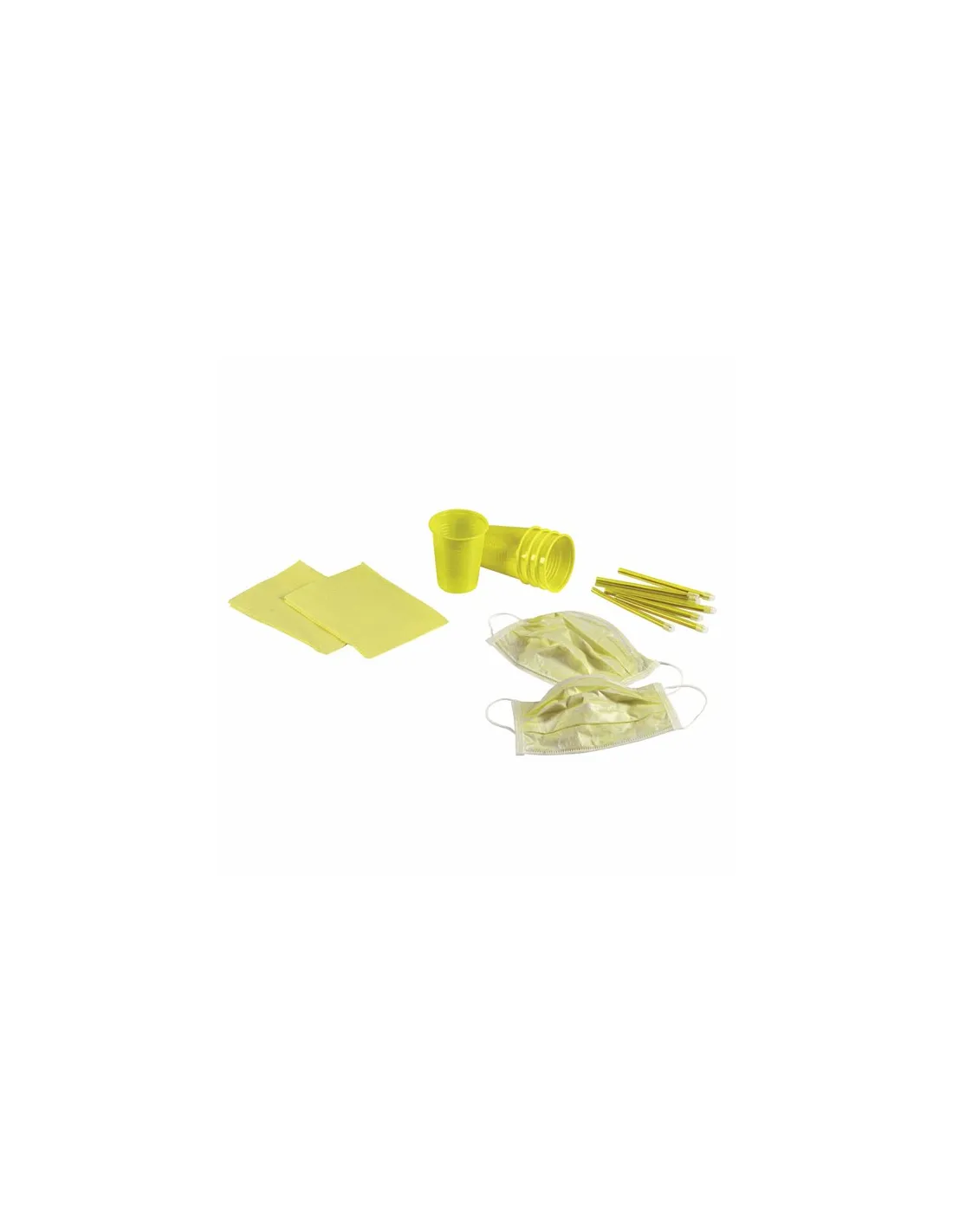 La caja de 500 kits individuales está compuesto cada uno por una servilleta, aspirador de saliva EM15, vaso de plástico y mascarilla protection 3, todo de la línea Monoart.