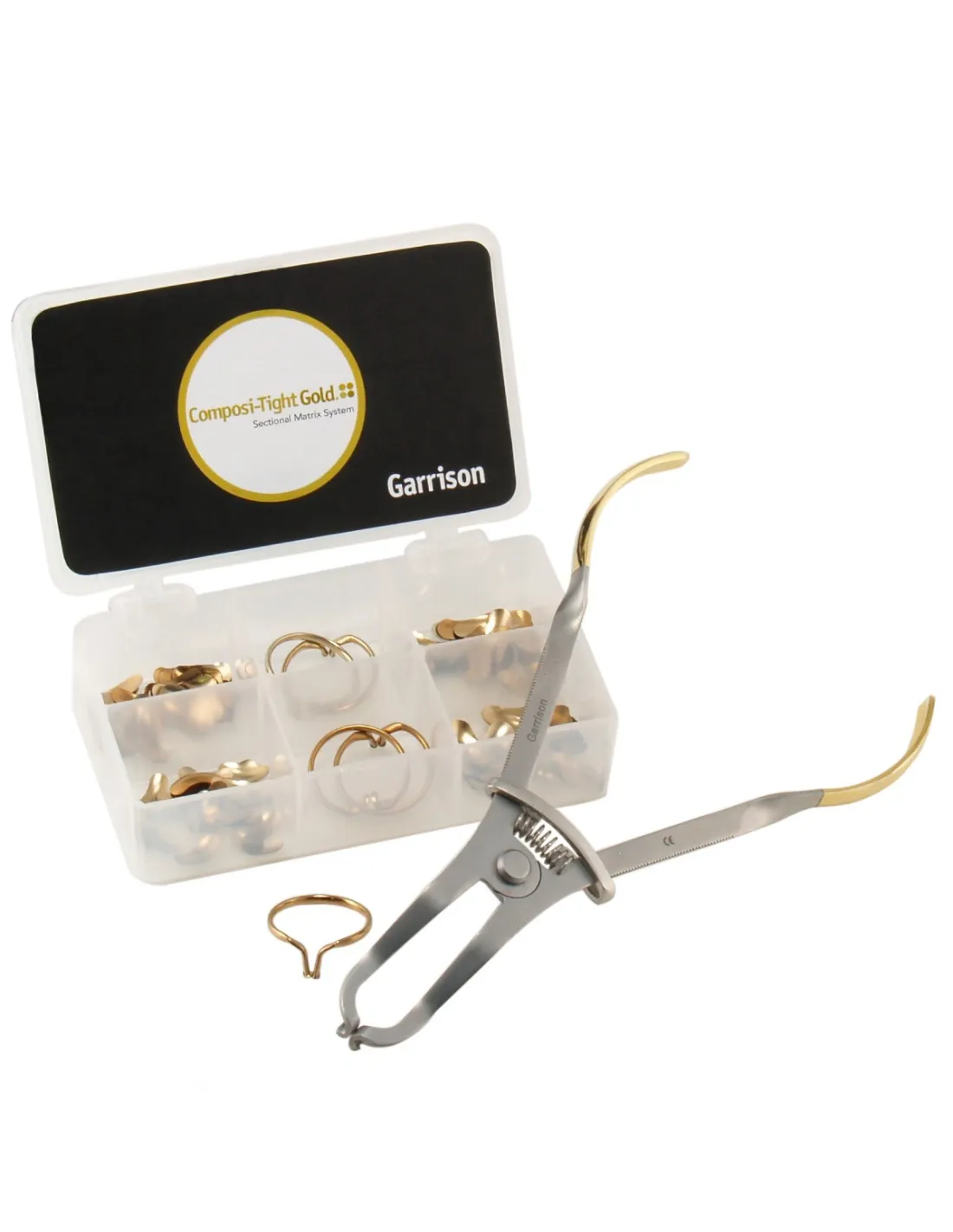 Cada kit completo de Composi-Tight Gold de Garrison contiene 250 matrices + 6 anillos + 1 pinza.