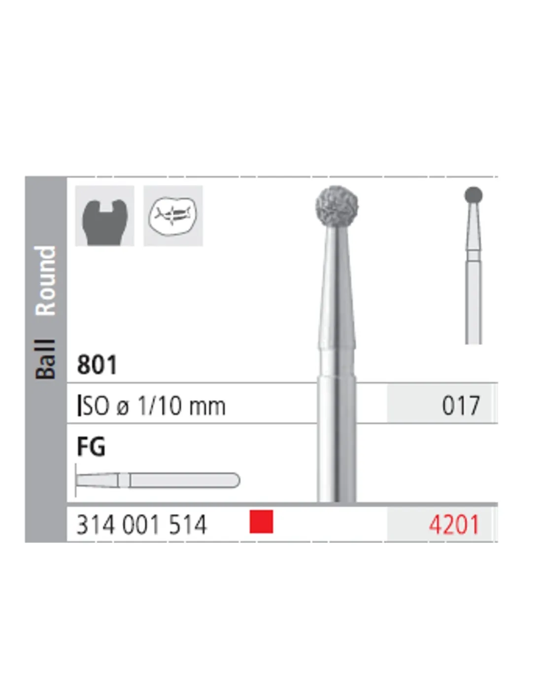 La fresa 801-017 con forma de bola, es una fresa diamante con grano medio y banda color rojo.