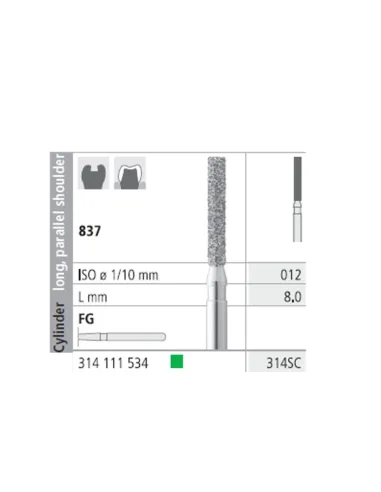 La fresa 837-012 presenta una parte activa con forma de cilindro, largo, hombro paralelo.