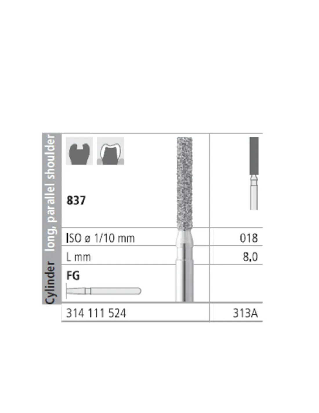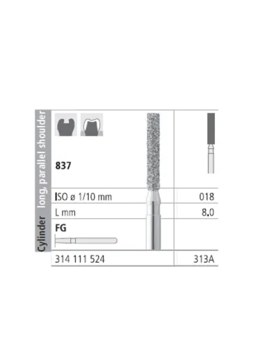 La fresa 837-018 presenta una parte activa con forma de cilindro, largo, hombro paralelo.