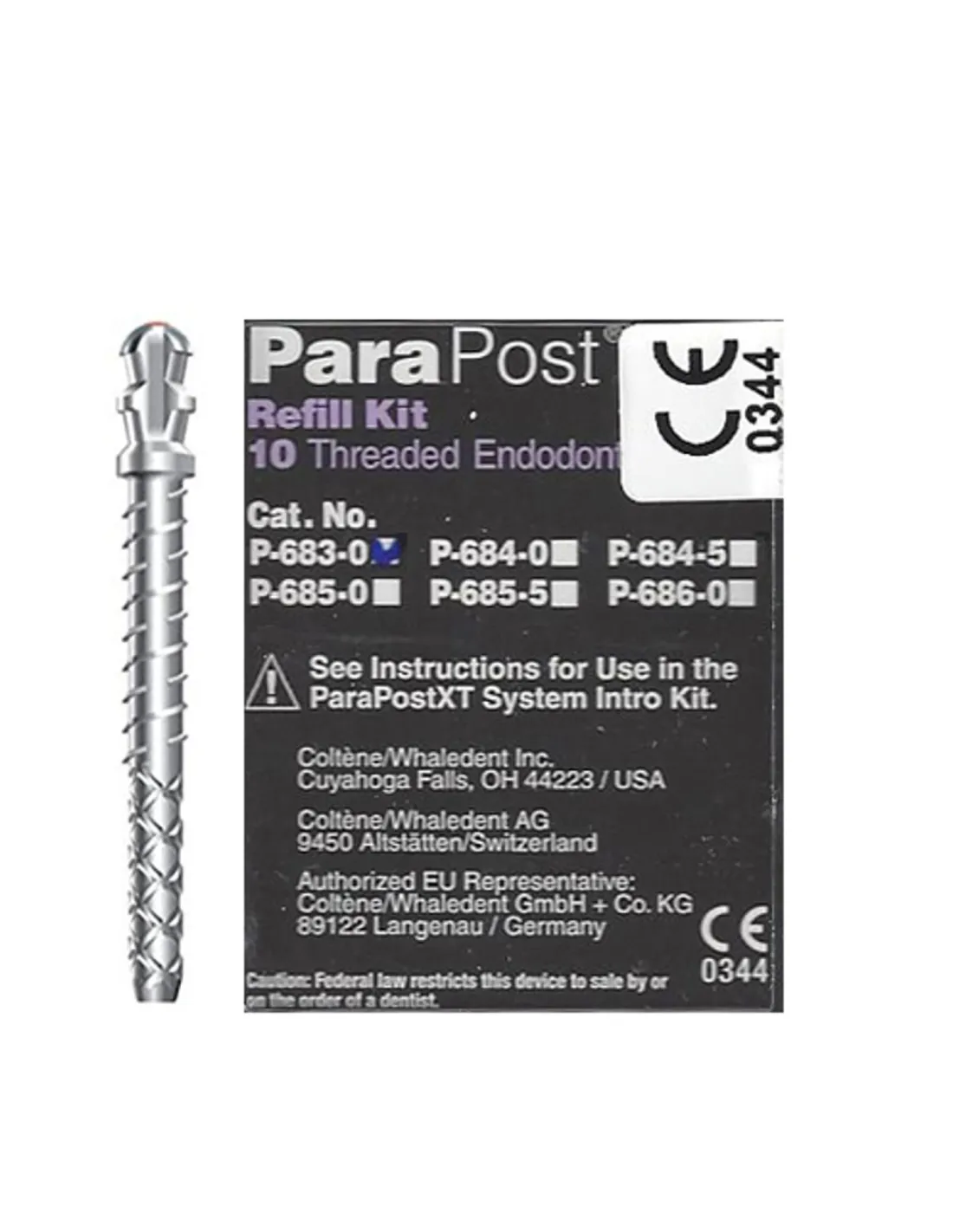 La caja reposición de pernos roscados ParaPost XT titanio de Coltène contiene 10 unidades a elegir tamaño entre los disponibles.