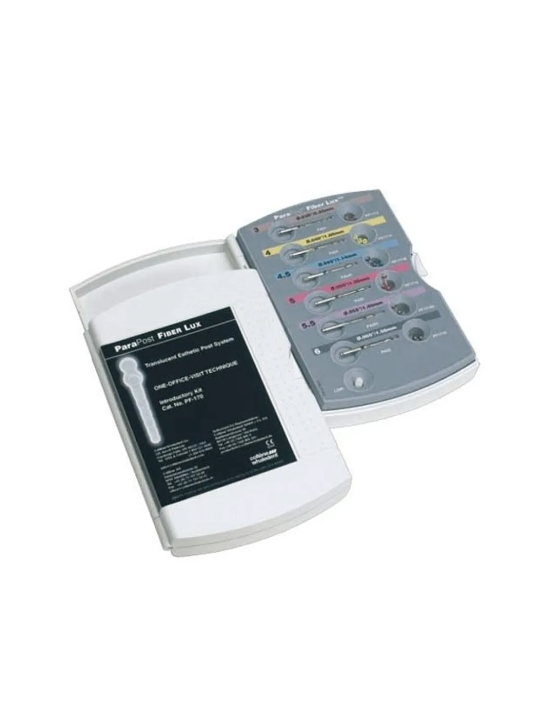 El kit intro ParaPost Fiber Lux de Coltène contiene 15 pernos en diferentes tamaños + brocas ParaPost estándar.