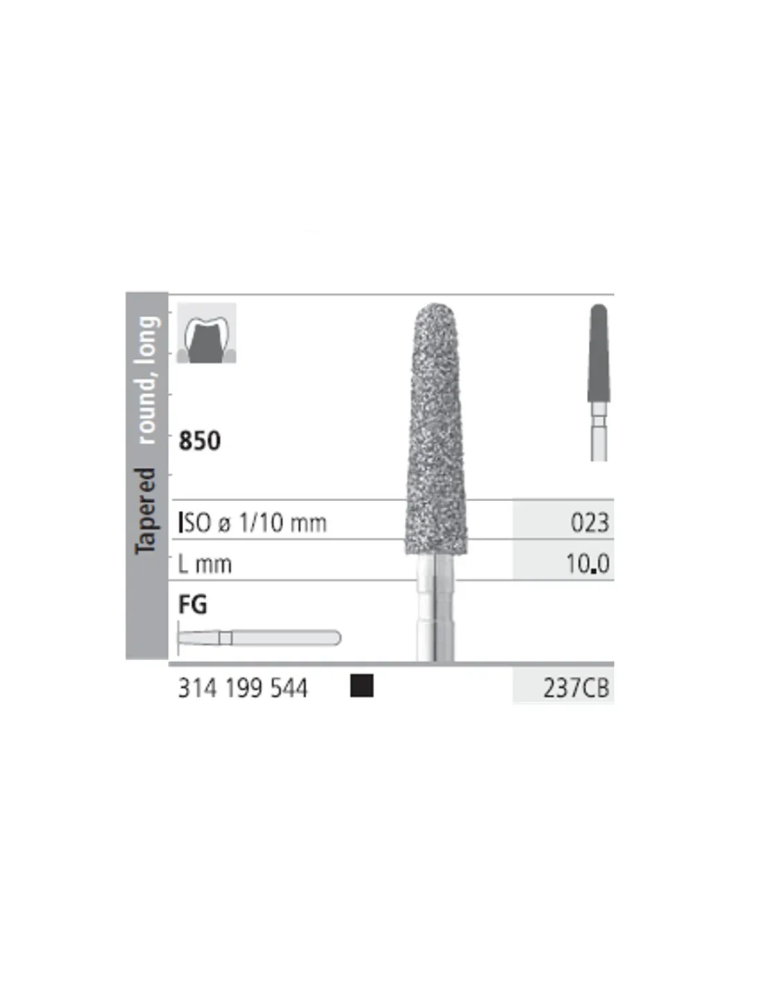La fresa 850-023 presenta su parte activa con forma: cónico, redondo, largo. Longitud 10 mm y Ø 023.