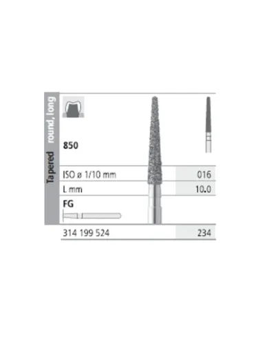 La fresa 850-016 presenta su parte activa con forma: cónico, redondo, largo. Longitud 10 mm y Ø 016.