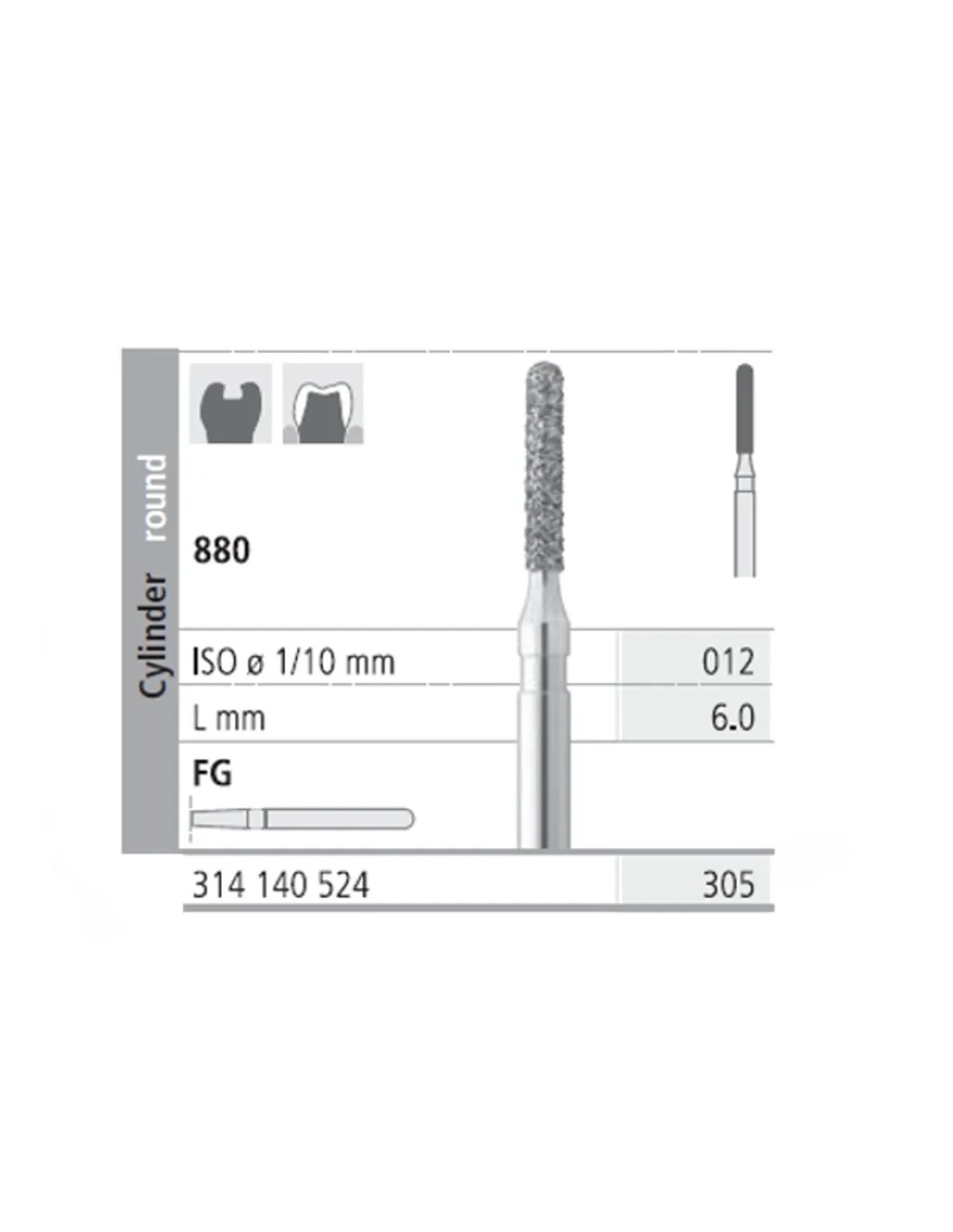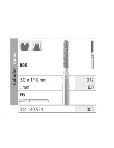La fresa 880-012 presenta su parte activa con forma de cilindro redondo. Tamaño Ø 012 y longitud 6 mm.
