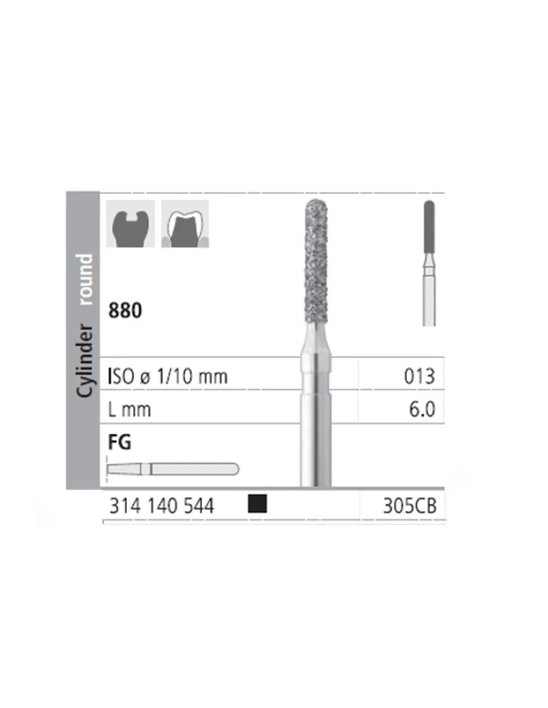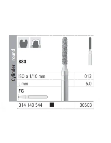 La fresa 880-013 presenta su parte activa con forma de cilindro redondo. Tamaño Ø 013 y longitud 6 mm.