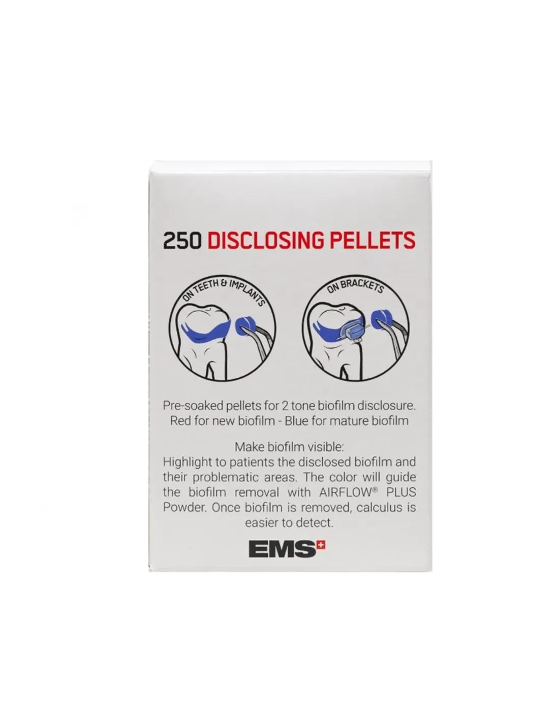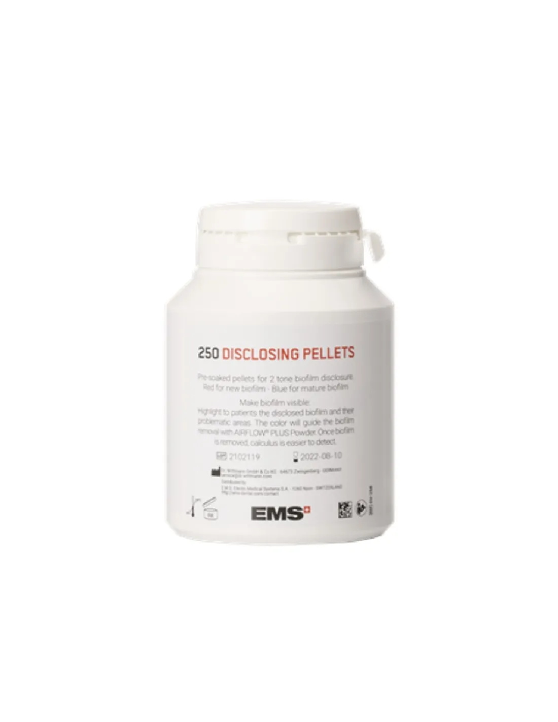 El bote del detector de placa Biofilm Discloser de EMS Dental contiene 250 pellets prehumedecidos .