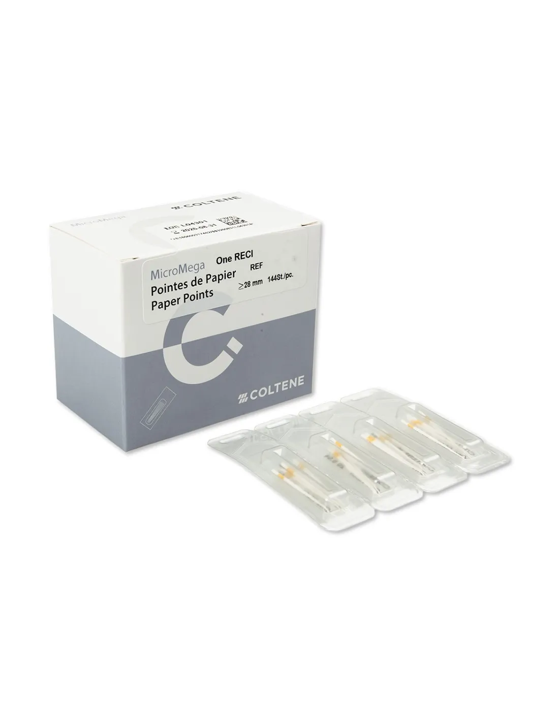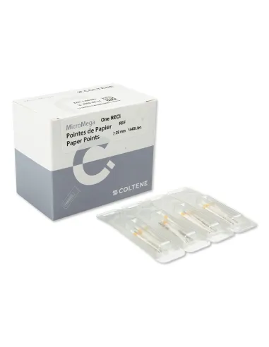 Las puntas de papel MicroMega One RECI de Coltène están adaptadas para el eficaz secado del conducto radicular previamente preparado con las limas recíprocas MicroMega One RECI.