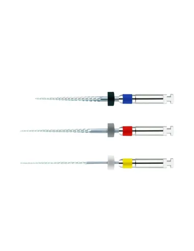 Las limas Ni-Ti presentan una conicidad variable al 2% (anillo blanco) y una longitud de 21 mm, están disponibles en 3 tamaños: 20 - 25 y 30