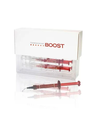 Opalescence Boost está formulado en gel de consistencia pegajosa y viscosa para evitar filtraciones fuera de la cubeta, y tras su activacción se dispensa directamente desde la jeringa, fluyendo de forma uniforme sin derrramarse.
