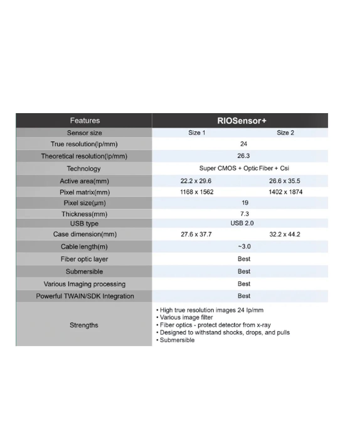 El sensor intraoral de alta resolución RIOSensor+ ofrece una imagen ideal a un simple clic de distancia. Cuenta con tres modos de mejora de imágenes anatómicas a las imágenes adquiridas: endodoncia, periodoncia y unión amelodentinaria.